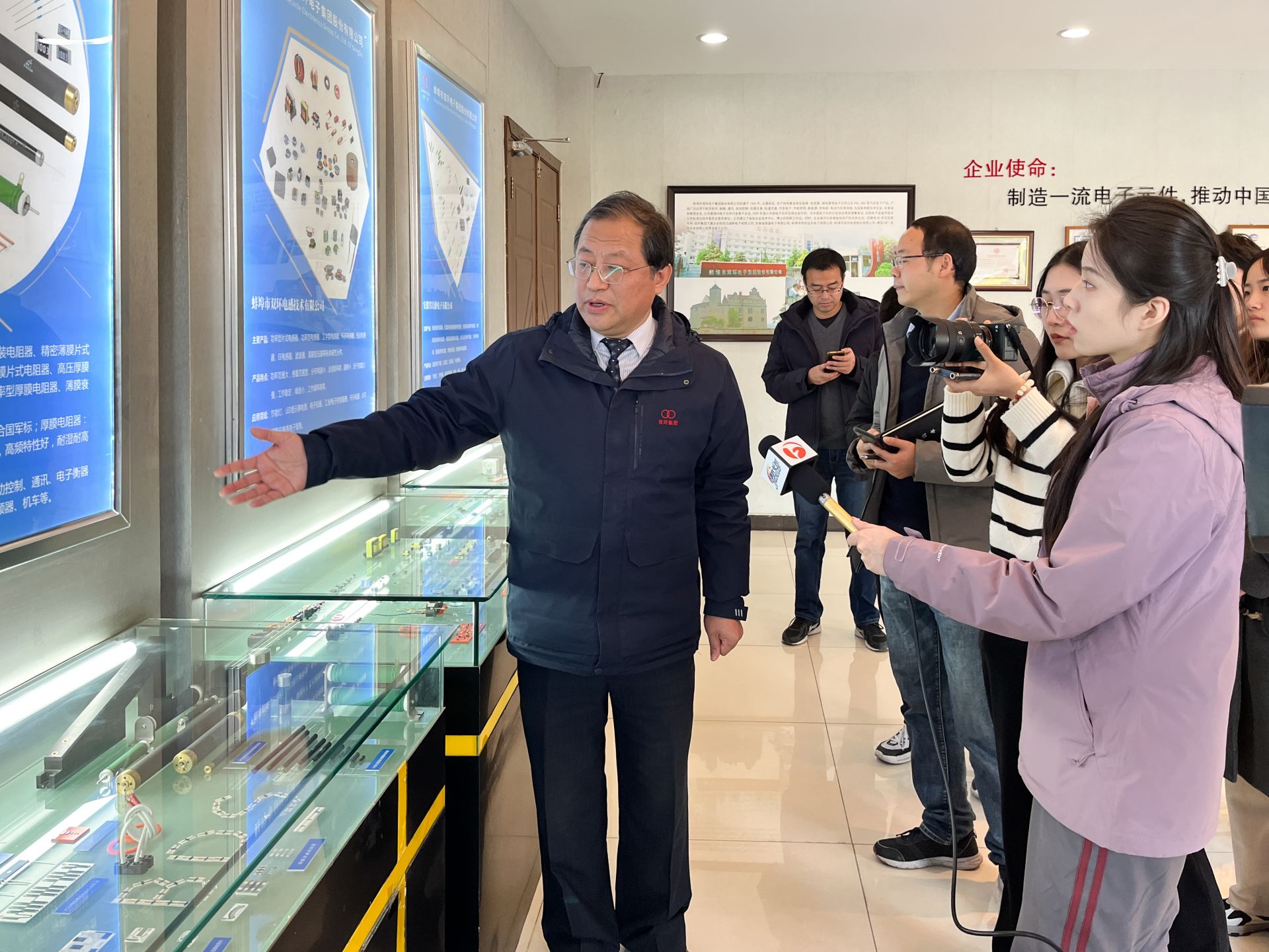 12月5日,媒体记者一同前往位于高新区的凯盛光伏材料有限公司,公司里陈列的一块块铜铟镓硒饰面发电玻璃备受记者们关注。参观完展厅和生产车间后,记者们的镜头对准了该公司的技术总监吴宗宪,集中采访了企业的科技创新成果,以及产品的产品优势、生产工艺、应用范围等情况。“拥有特殊涂层的饰面发电玻璃既不影响建筑物的美观性,又能够利用太阳能进行发电,实现了双赢。”从安徽经济报记者赵晓莹表示,凯盛光伏发电玻璃的推广可以助力建筑业转型升级,为实现“双碳”目标赋能。随后,采访团走进了蚌埠市双环电子集团有限公司,这是一家从事电阻器及电子元器件研发、生产和经营的企业。记者们深入企业车间,了解产品生产的全过程。
