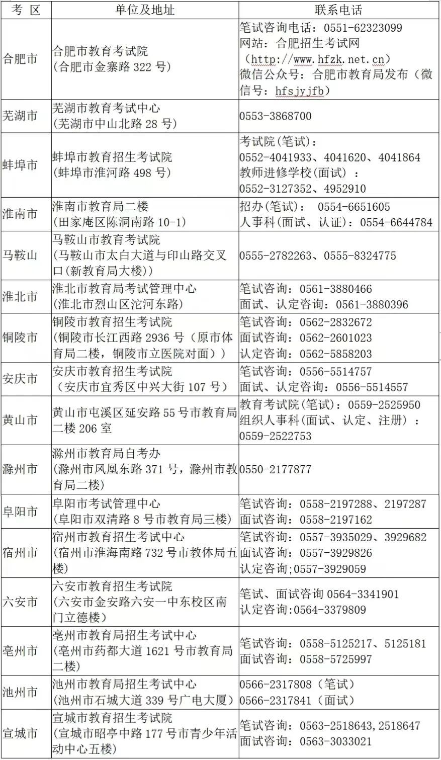 安徽省2024年上半年中小学教师资格考试笔试报名网上审核各市联系方式