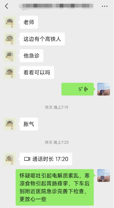 齐亚军是安徽中医药大学针灸推拿学院讲师、主治医师,他告诉记者,“手机视频电话连通后,发现那位乘客面容痛苦、手指拘挛、腹部胀痛难忍、四肢麻木,情况还是特别紧急的。”经过与乘客和乘客家属沟通既往病史,他指导秦鸣蔚同学进行心率体温检查、腹部触诊、穴位按压操作,“鸣蔚同学很冷静,穴位按压位置比较准确,乘客面部痛苦表情有所缓解”。