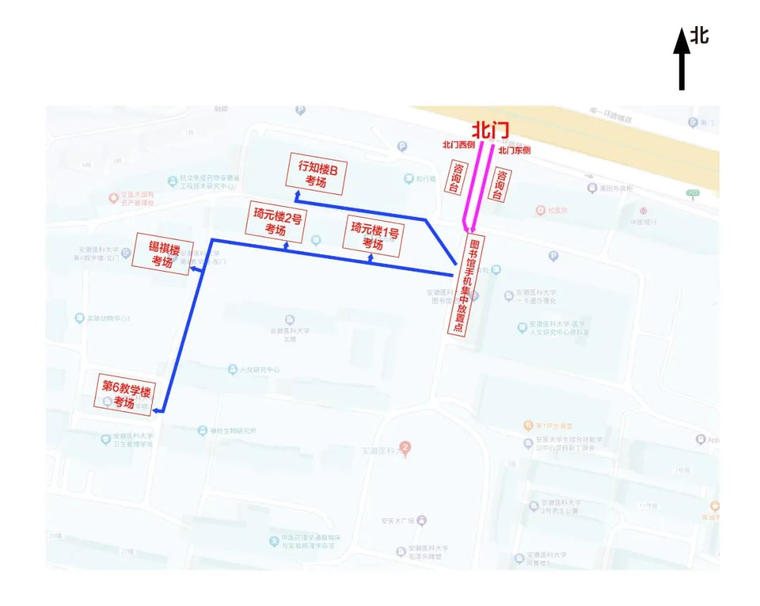 4.安徽医科大学(梅山路校区)北门(南一环路)为本次考试唯一出入通道。请提前熟悉考点的交通路线、考场具体位置及周边环境等(如下图),合理规划行程路线,错峰前往考点,具体信息请及时关注安徽医科大学继续教育学院网站(网址:https://jxjy.ahmu.edu.cn/)。