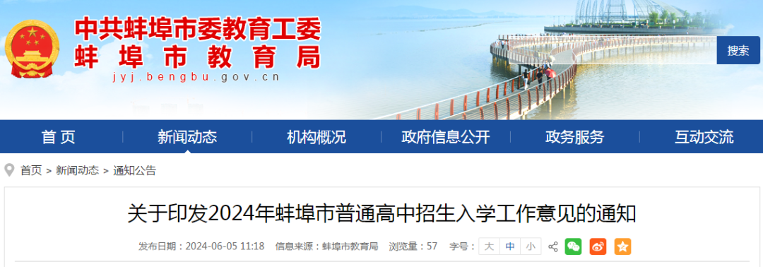 为贯彻落实安徽省教育厅《关于做好2024年普通中小学招生入学工作的通知》(皖教秘基〔2024〕67号)等文件精神,结合我市实际,制定《2024年蚌埠市普通高中招生入学工作意见》,现印发给你们,请按照要求将招生政策及时、准确地向全体师生及学生家长进行宣传,确保今年我市普通高中招生入学工作顺利进行。