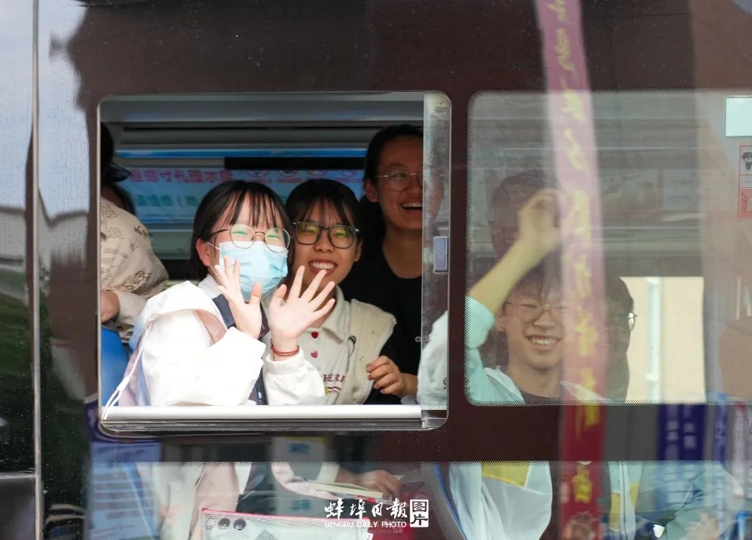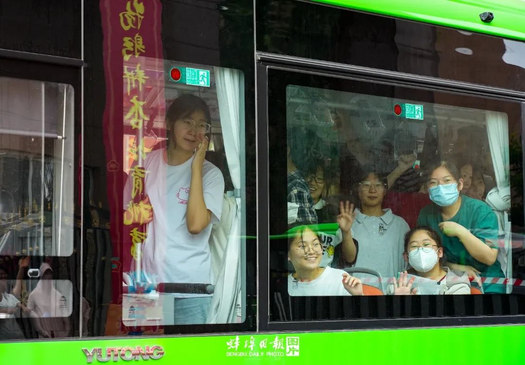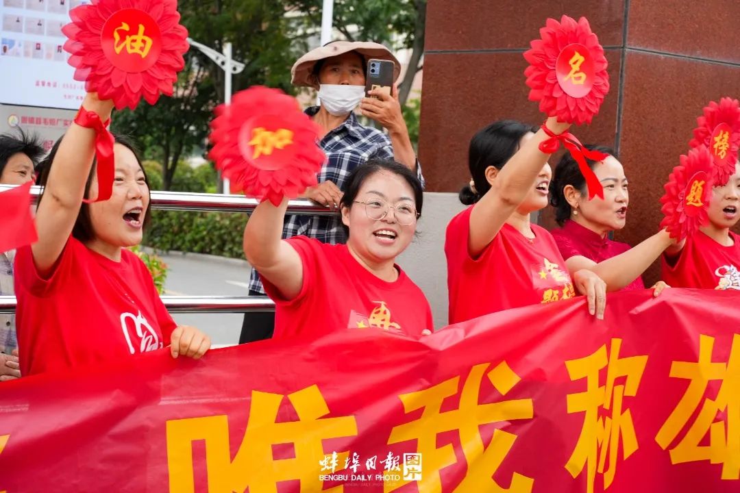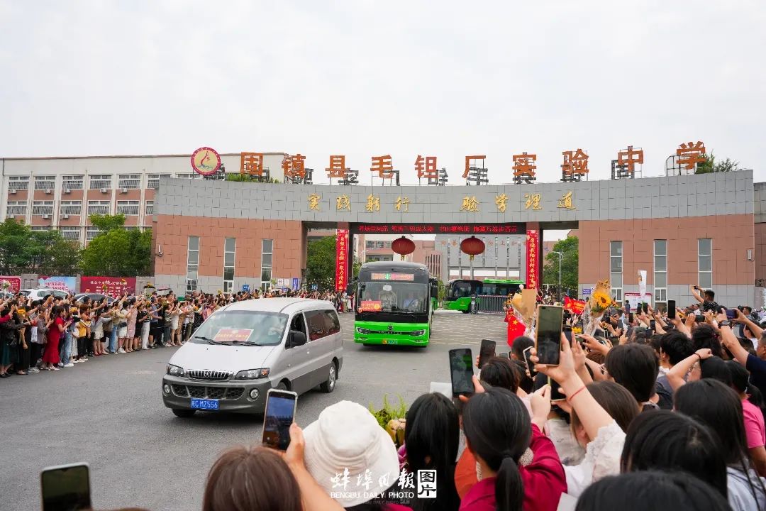 ▲上午7点58分,固镇县毛钽厂实验中学近3000名参加高考的考生,乘坐55辆满载希望的送考车,从学校南大门缓缓驶出,奔赴县城三个考点。周边群众及部分考生家长自发为考生壮行。