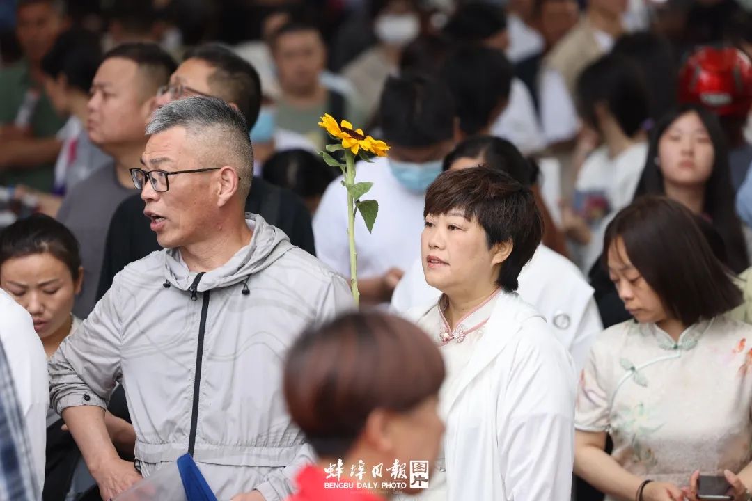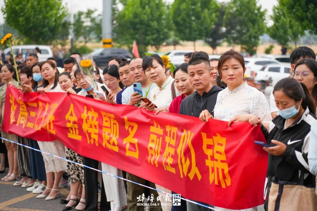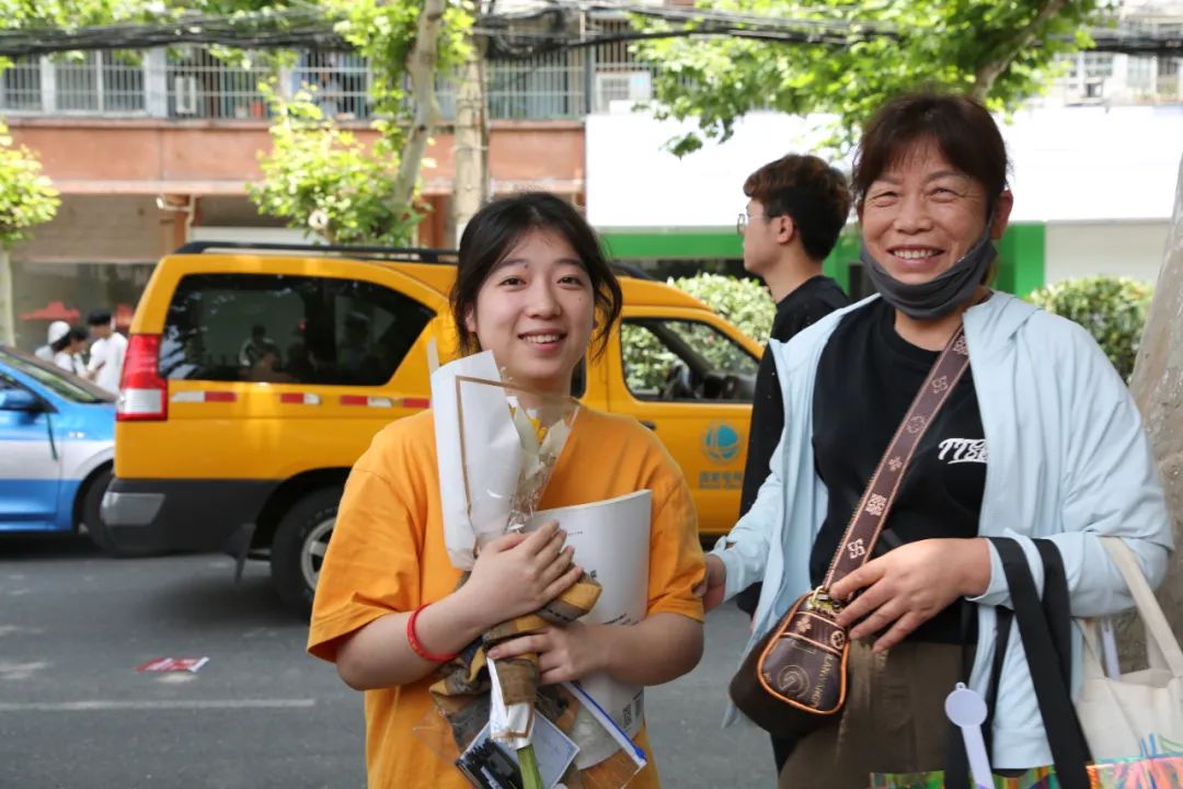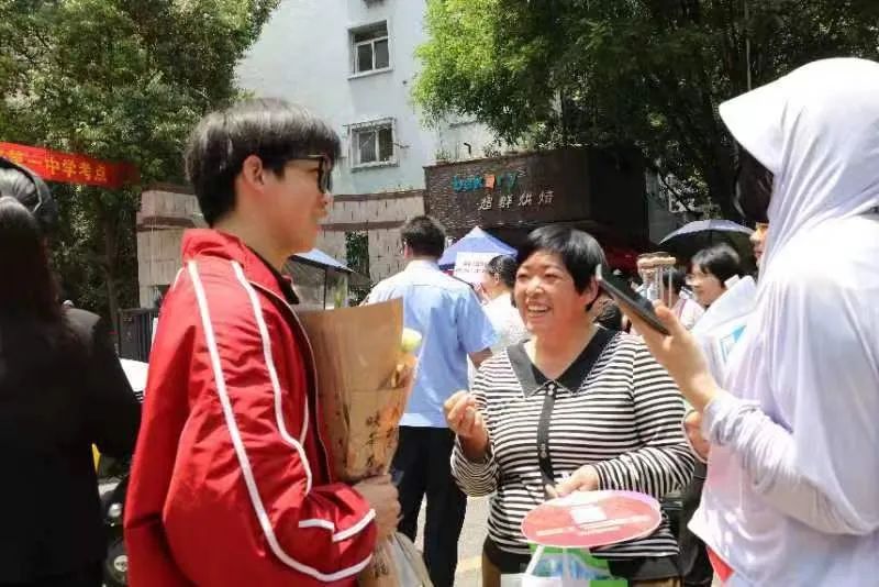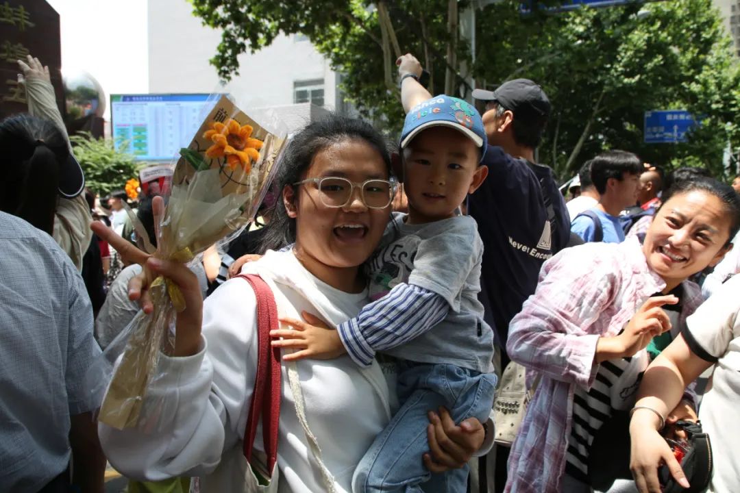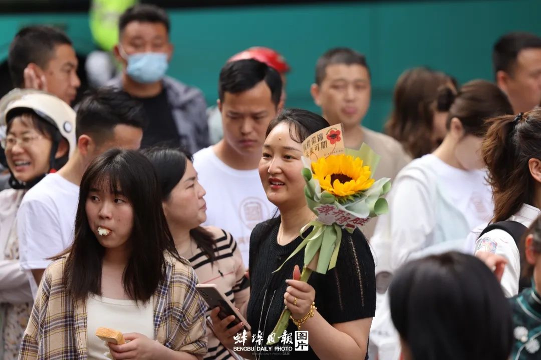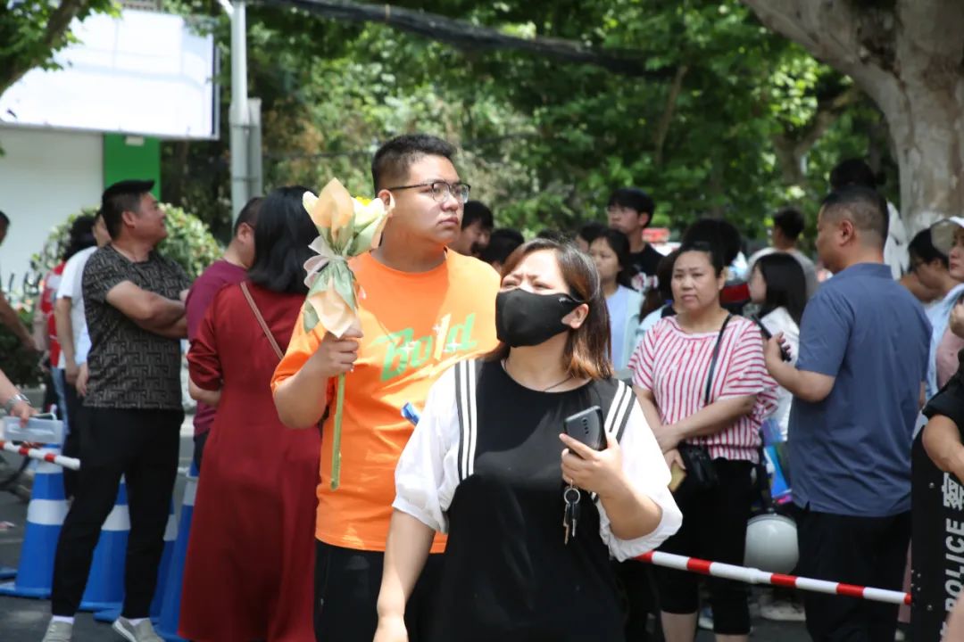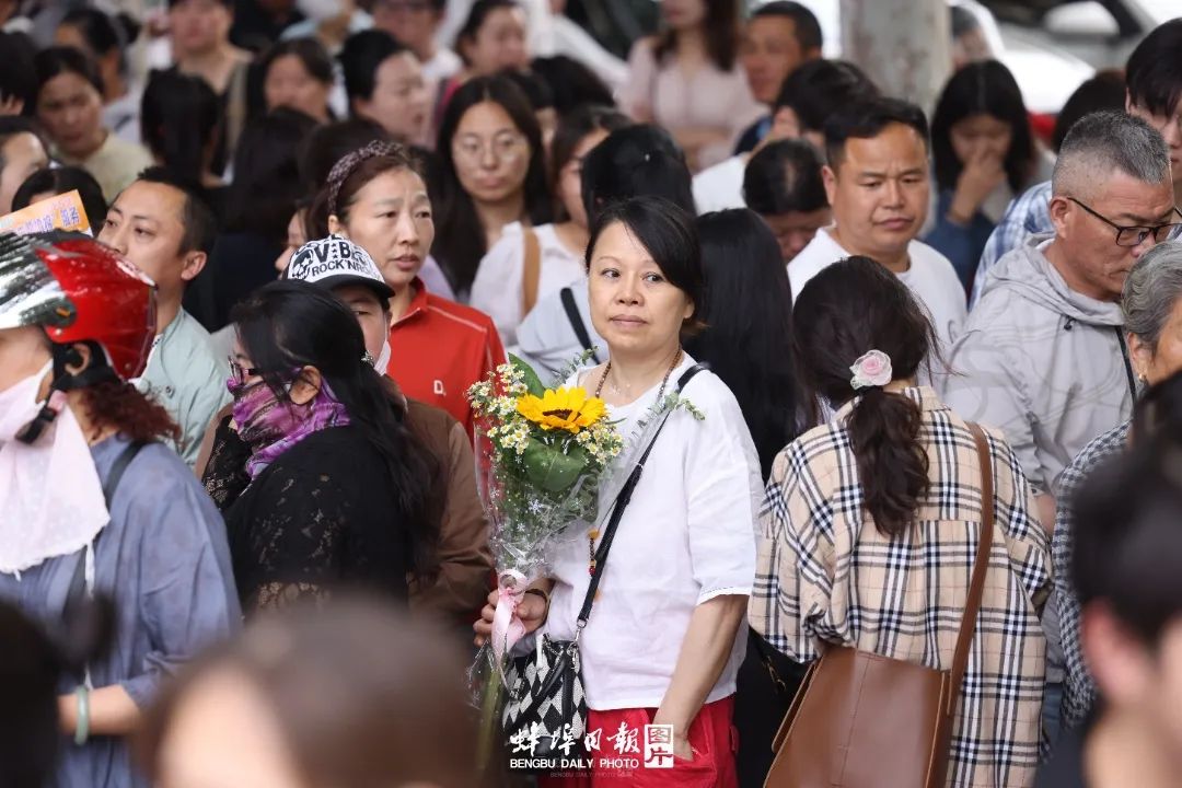 ▲家长们带着鲜花来送考,殷切的眼神祝愿孩子“一举夺魁”。