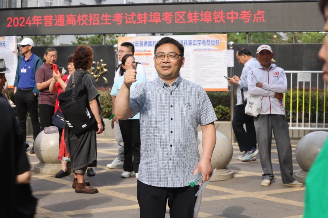 6月7日8点42分。蚌埠市第三中学考点,蚌埠二中高三(9)班班主任胡敏在迎接自己学生进入考场,为他们鼓励加油。 刘新义 摄