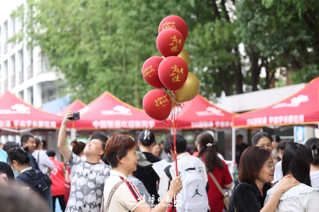 ▲考场外,一位家长拉着气球,希望孩子们在考场上“高考必胜”。
