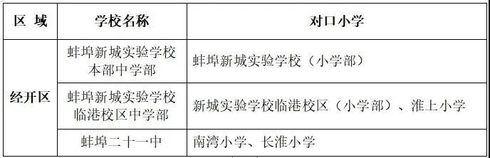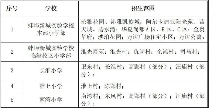 注:淮上区奥莱当代城小区对口学区为规划建设中的淝河路小学,在淝河路小学建成前,该小区已交付房屋业主的适龄子女入学小学阶段的,暂时对口淮上区太平岗小学和蚌埠市星河小学(自愿);入学初中阶段的,对口蚌埠第二十中学。淝河路小学建成招生后,该小区业主适龄子女当年就读小学一年级的统一入学淝河路小学,以后学区如果变动,以当年政府招生文件公布的学区为准。