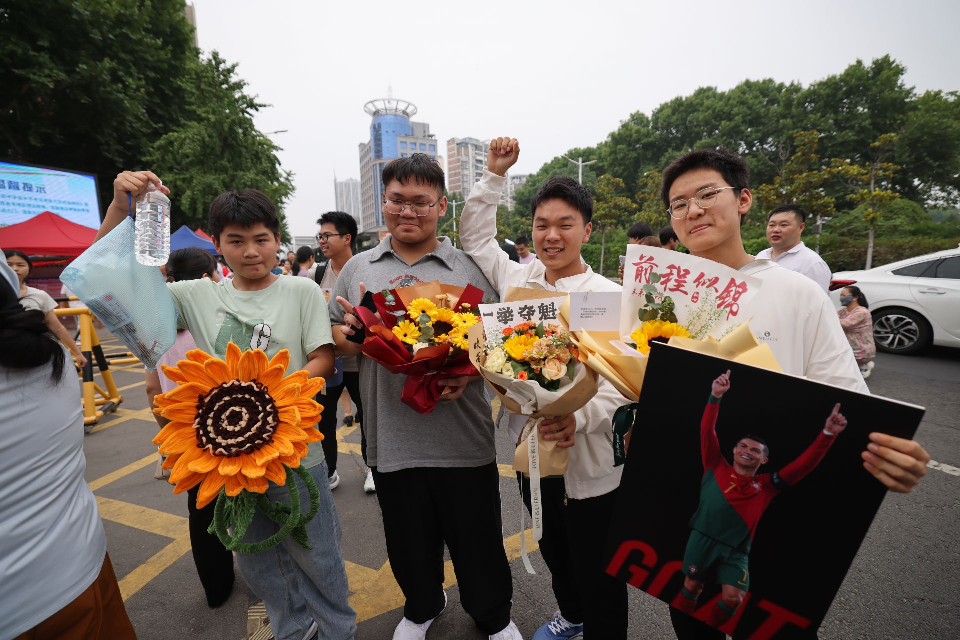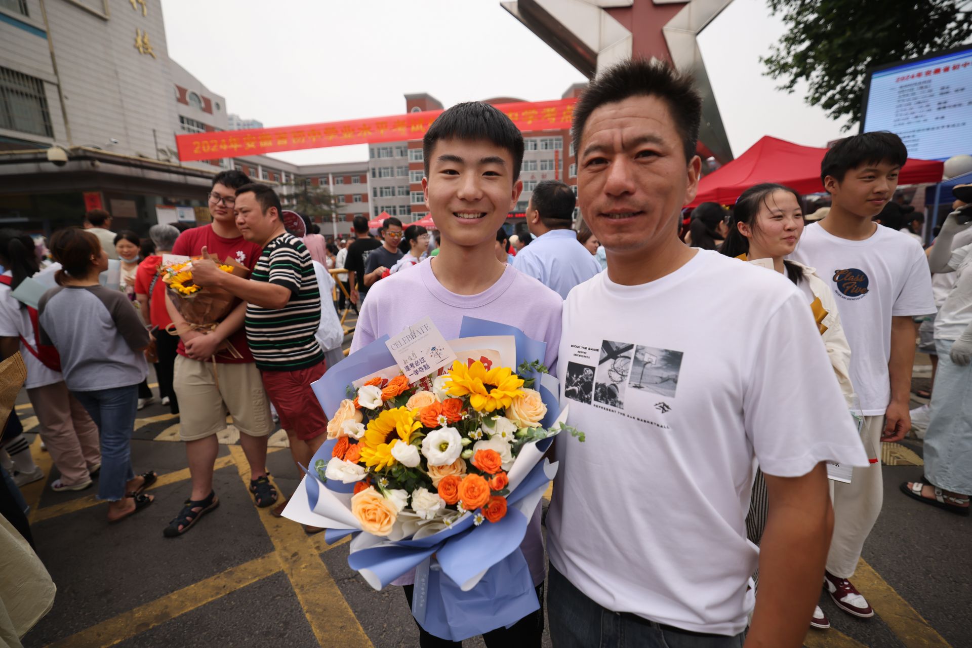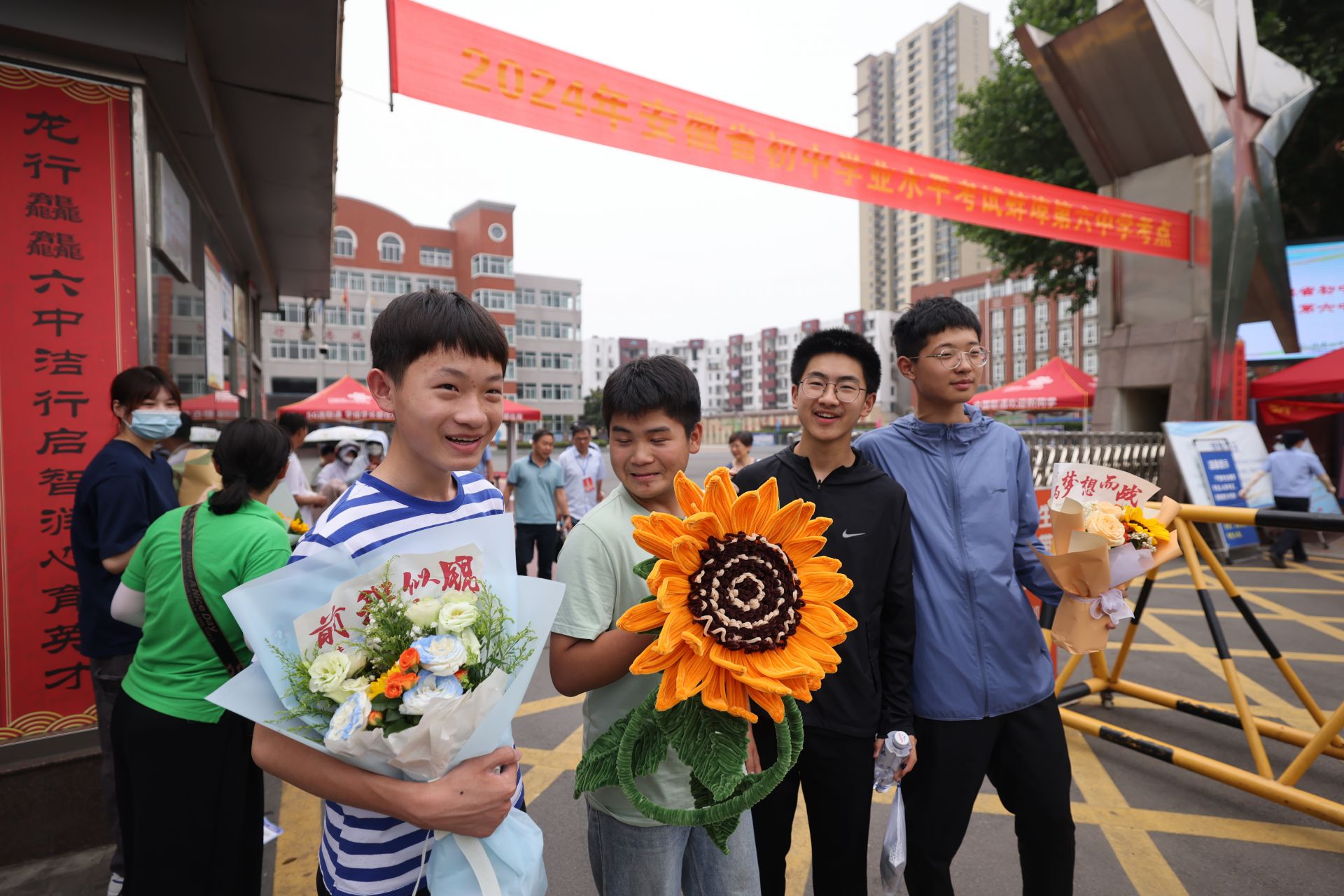 6月16日上午10点半,随着英语交卷铃声响起,2024年蚌埠初中学业水平考试九年级科目全部结束。在六中考点,家长手捧鲜花迎接考生。(融媒体记者 陈昂 摄)