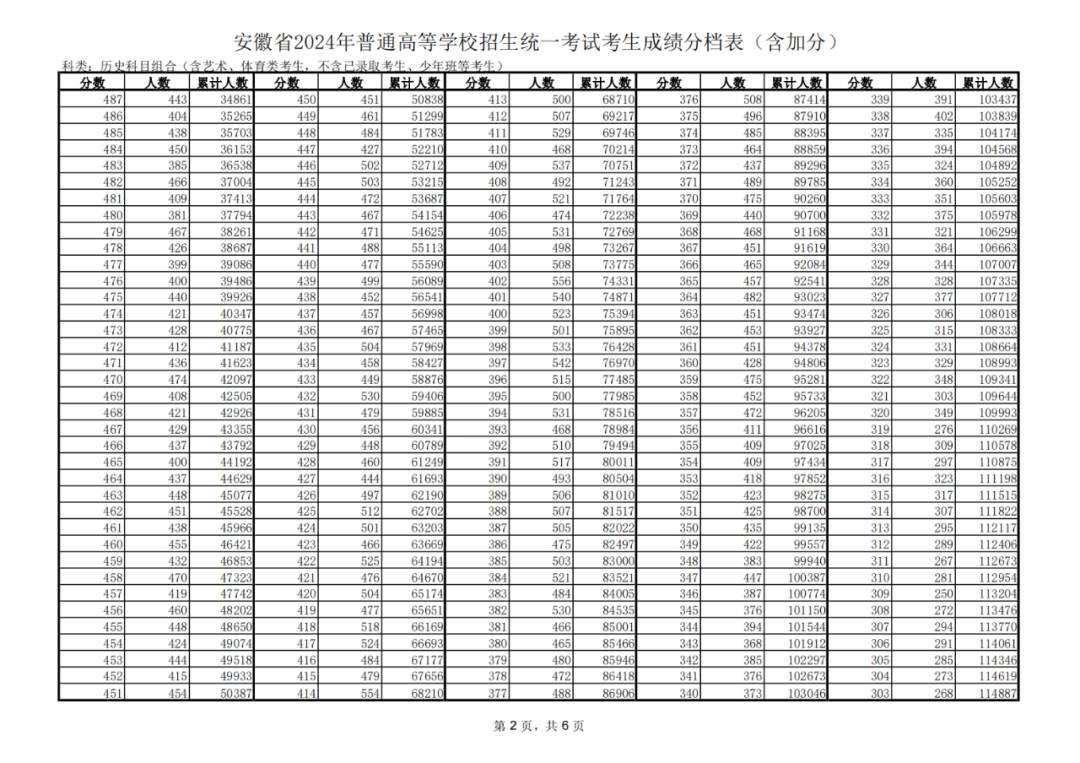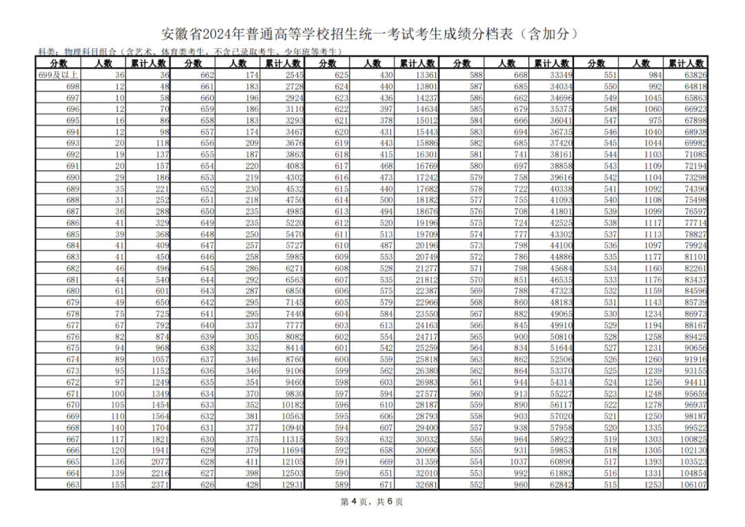 安徽省2024年普通高等学校招生统一考试考生成绩分档表(含加分)