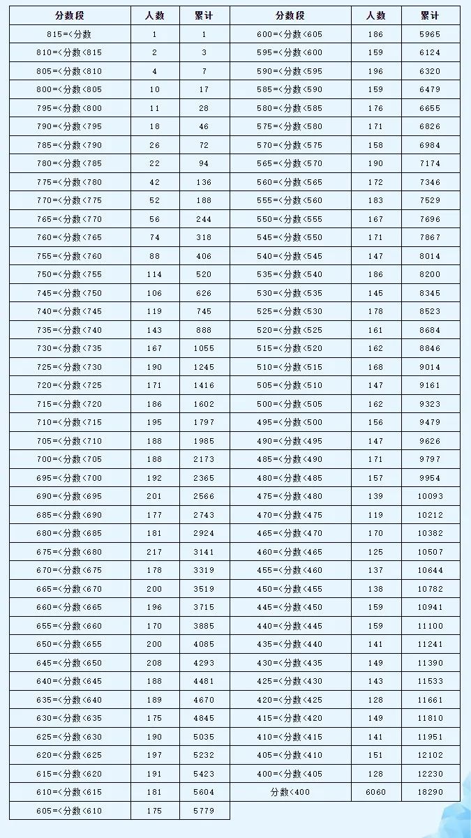 今年怀远县共有18290人报名参加中考,相比去年增加了1502人。今年和去年一样,中考总分包括中考文化课、初二生物地理、体育考试和理科实验操作,合计仍为850分。而今年中考总分从五分一段分档表来看,800分以上(含800分)的考生有17人,700分以上(含700分)的考生有2173人。