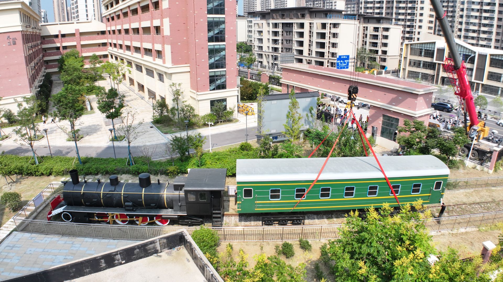 蚌埠发布客户端讯 8月31日早晨,蚌埠市禹会区秀水实验学校北门,一节1:1比例的火车模型被吊车运送到校内铁轨上,该校成为一所拥有“火车”的学校。