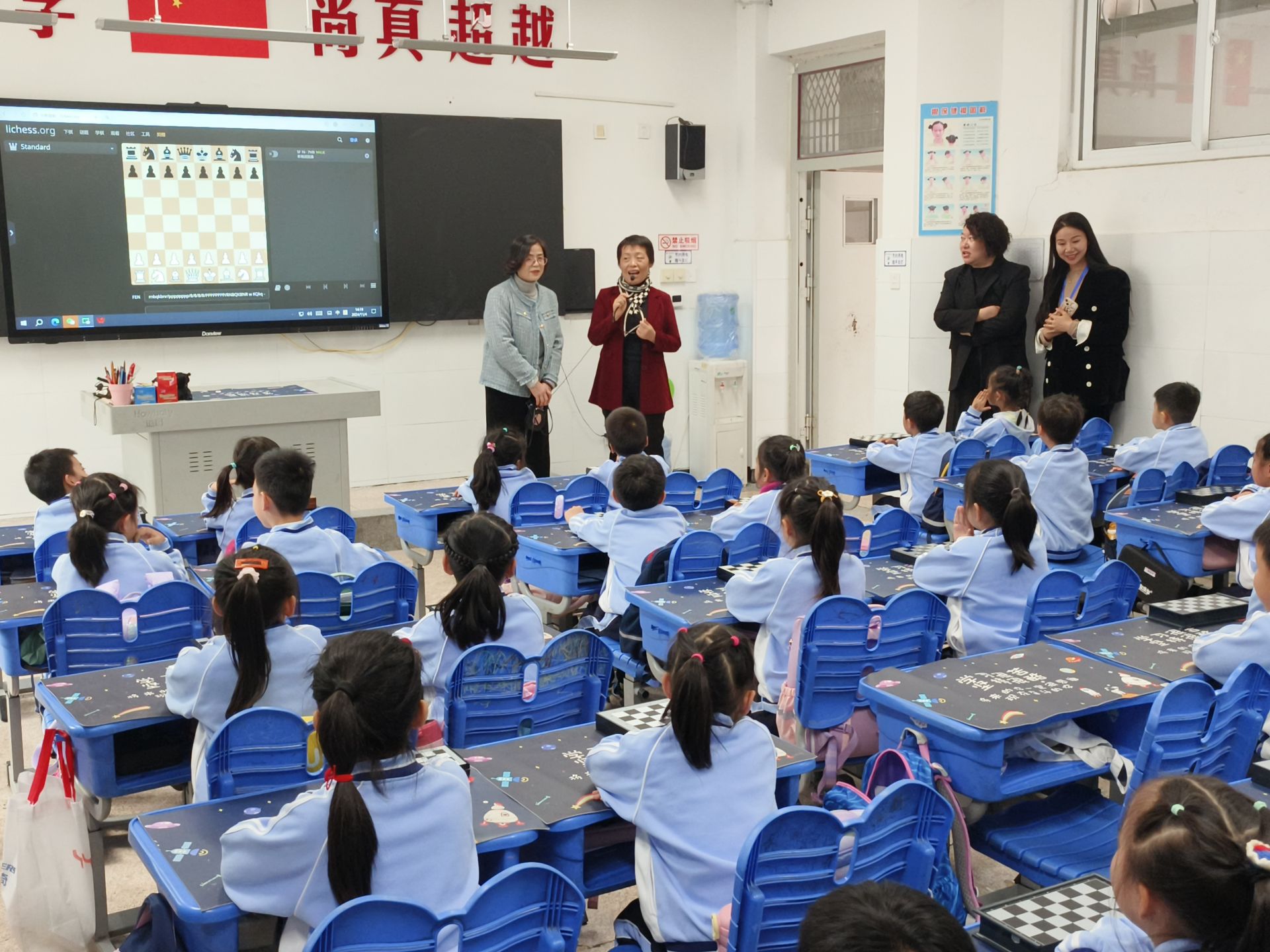 在蚌埠六中七(18)班、新城滨湖学校一(9)班课堂,谢军分别观摩了别具特色的国际象棋校本课程。课堂上,学生们对国际象棋展现出浓厚兴趣和扎实基础,他们认真听讲、积极讨论。谢军对学生们的表现给予高度评价,并分享了自己在国际象棋领域的宝贵经验和心得,在小棋手们的心中深植下“国象”种子,激励大家不断努力、追求卓越。