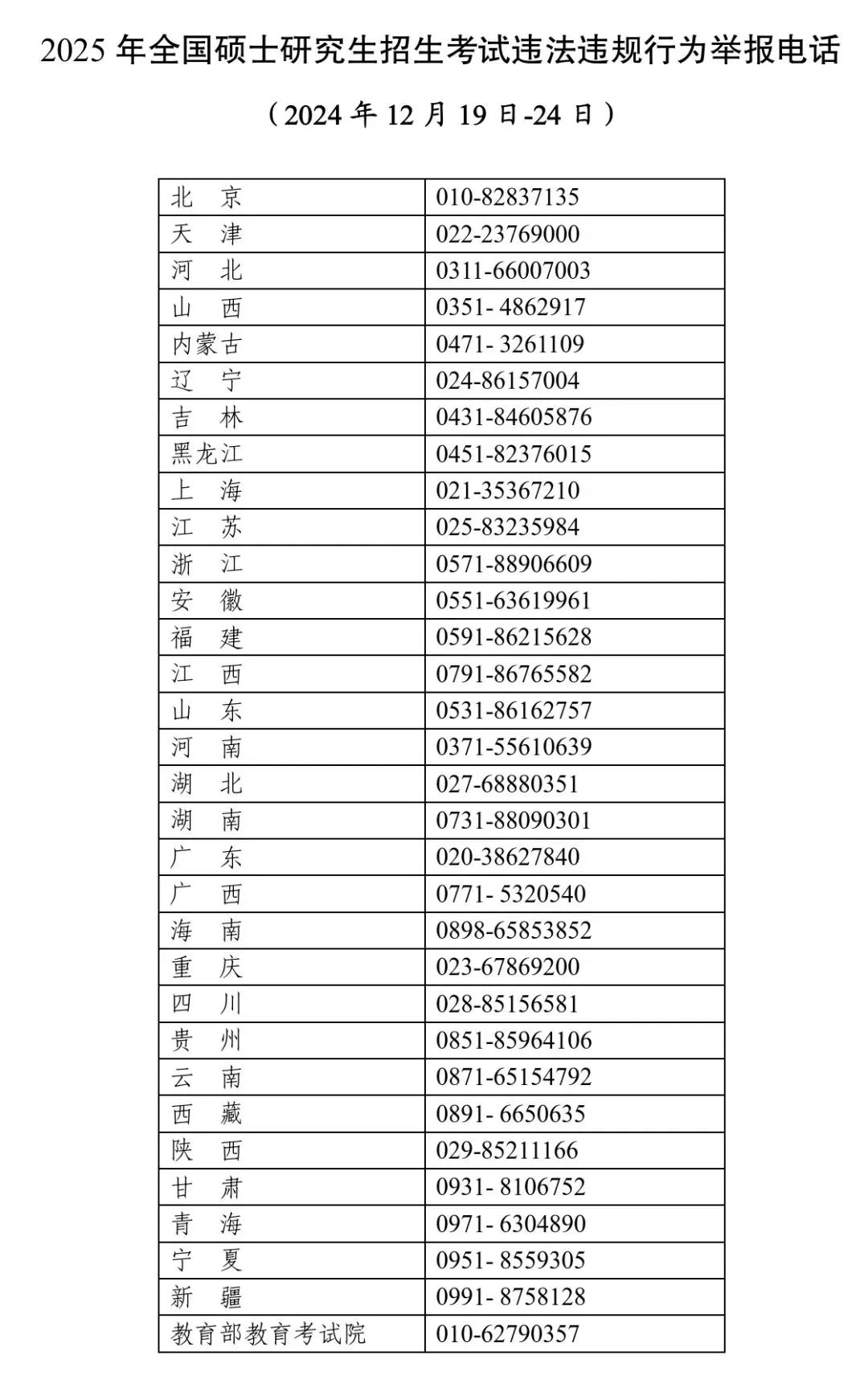 现将2025年全国硕士研究生招生考试违法违规行为举报电话向社会公告,欢迎参与监督,共同营造良好考试环境。