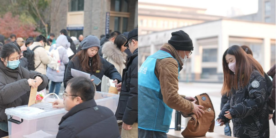 研考考生按照规定,将手机等物品放到指定位置,并依次安检入场。