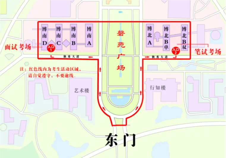 3.参加面试的考生按准考证中规定的考试时间,携带本人《准考证》和《身份证》,提前1小时到达安徽大学磬苑校区东门(环翠路)入口处排队核验身份进入考点,提前30分钟到达博学南楼D楼入口处进行违规物品检查,通过人脸识别检录并按照计算机随机分配的考场进入相应的候考室,抽签决定考试顺序,由工作人员带领进入考场待考。考生务必在准考证中规定的考试时间前完成检录,严禁迟到,迟到者视其为自动弃考。