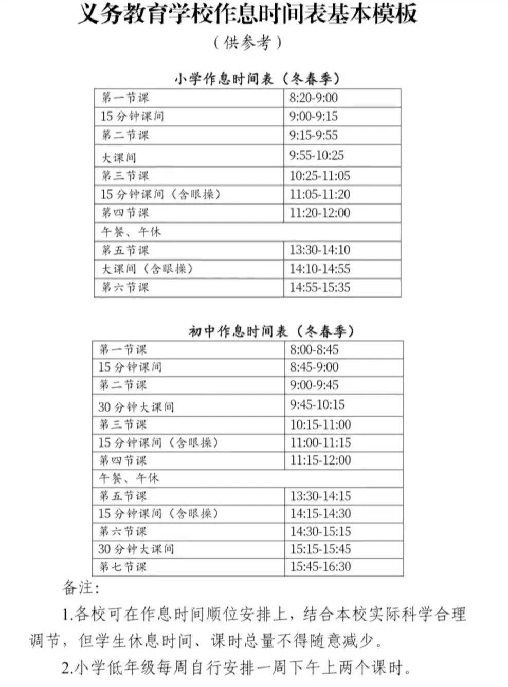 各学校上午最后一节课下课不晚于12点,下午第一节课上课不早于13:30,保证学生1.5小时的就餐、午休和自由活动时间;