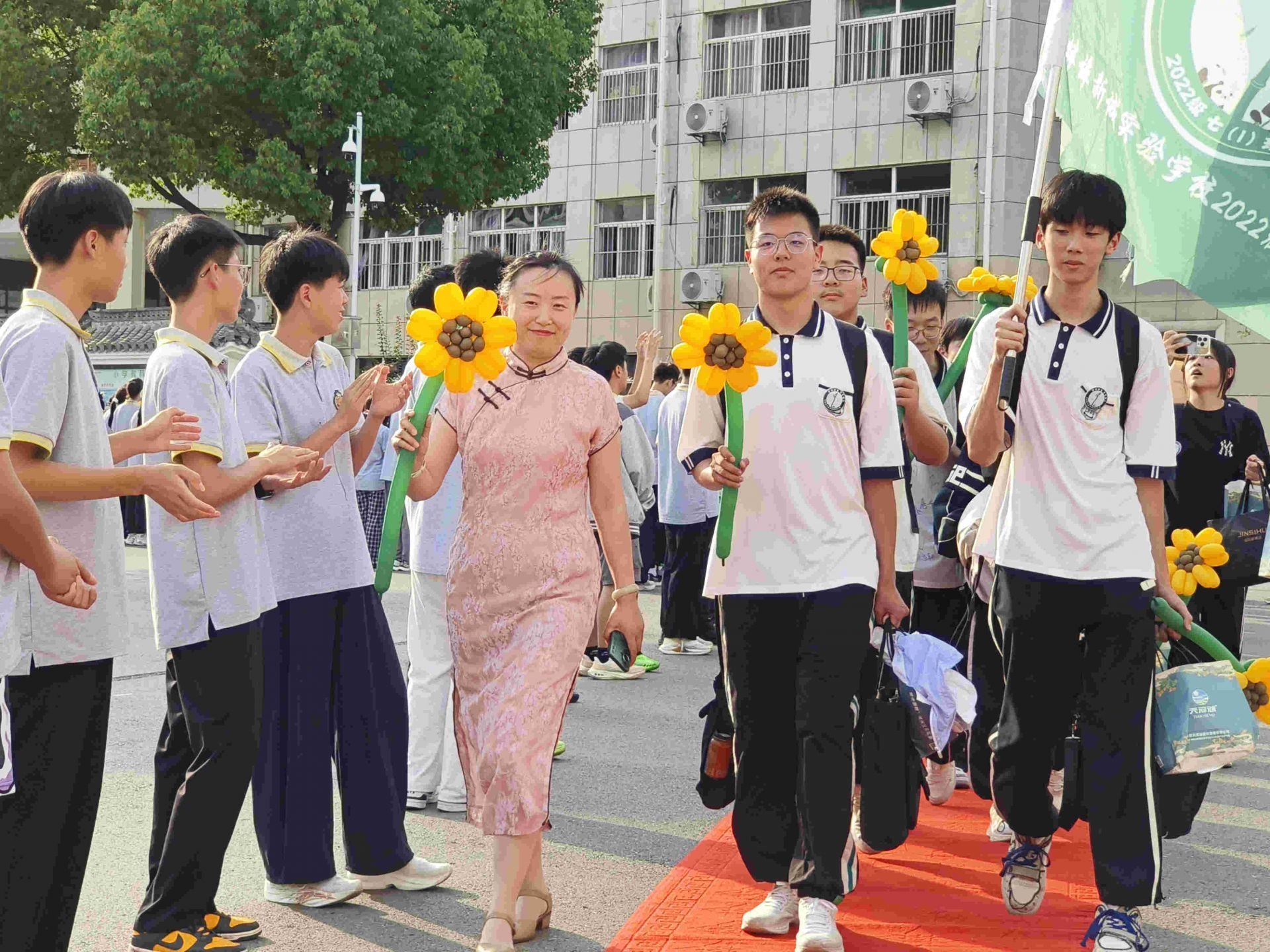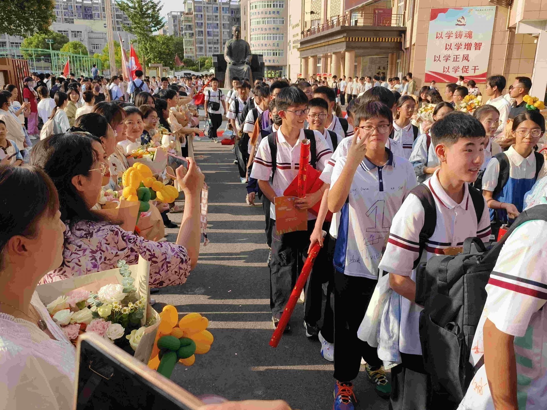 6月11日,蚌埠新城实验学校举行九年级离校欢送仪式。当日,老师们和八年级学生组成多个方阵,手持“花式祝福”标语列队欢送,并向他们真情告白,送上中考的祝福,借此加强在校学生的思想品德教育。(融媒体记者 刘晨 摄)