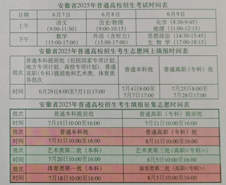 安徽省教育招生考试院提醒,志愿填报官方网址为xgk.ahzsks.cn,成绩及录取结果查询网址为cx.ahzsks.cn。依据安徽省2025年普通高校招生工作实施办法,录取工作于7月初开始,8月中旬结束。