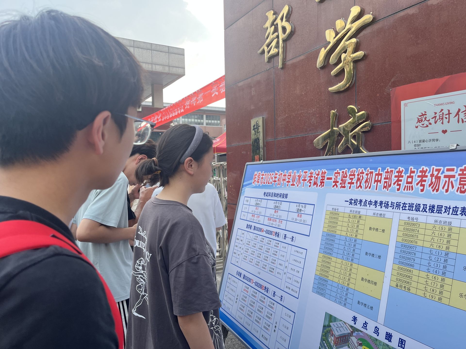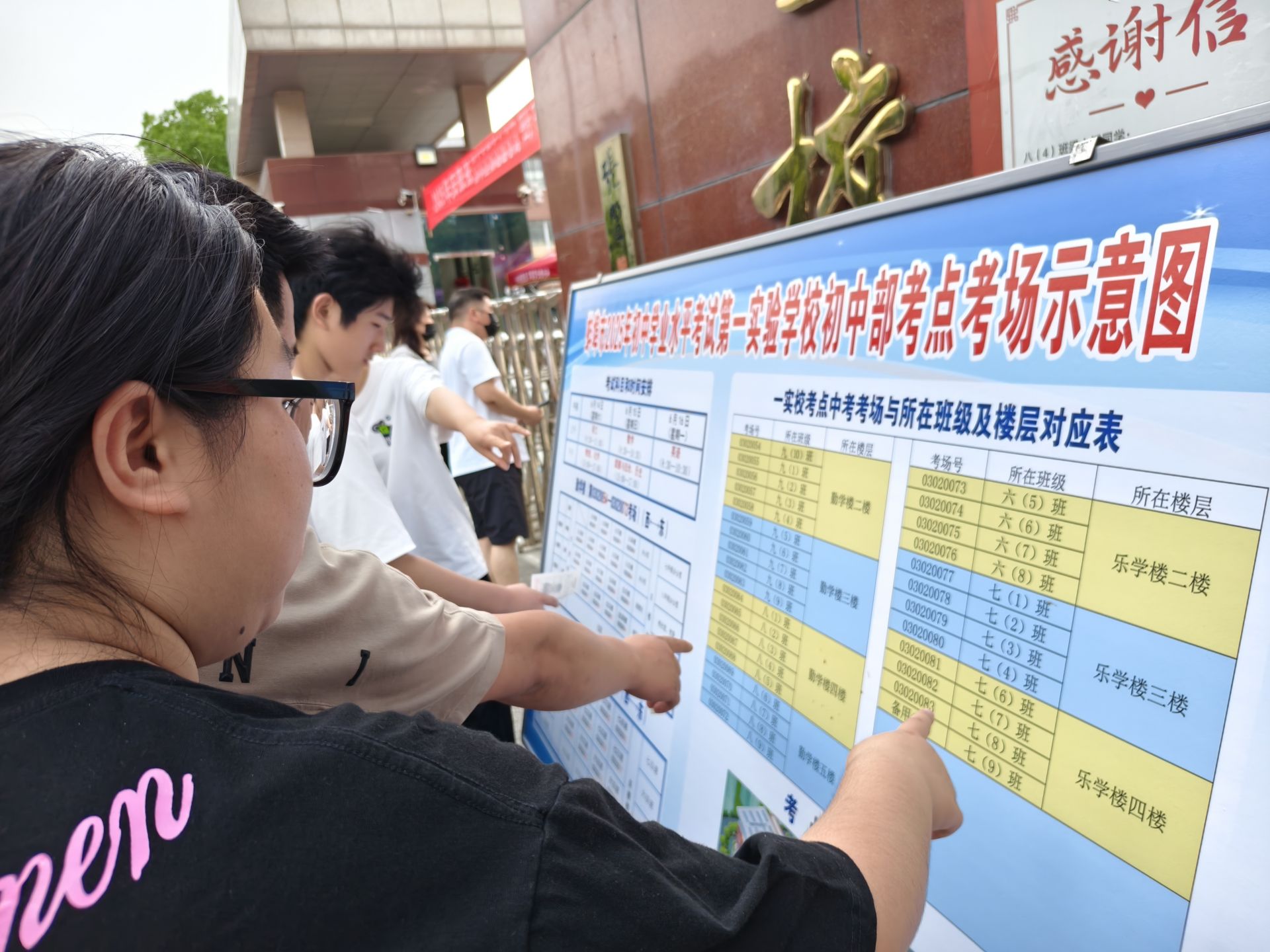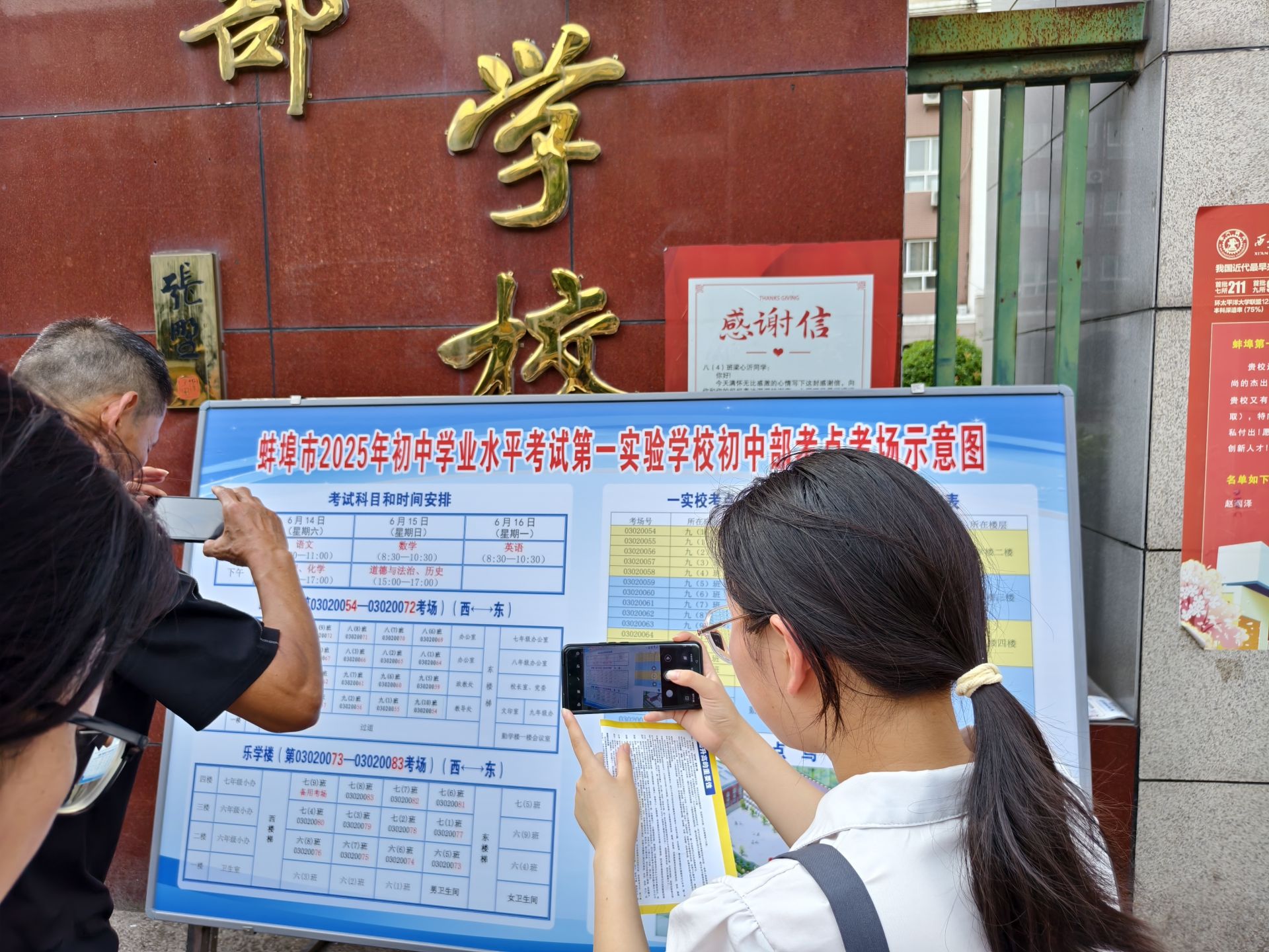 2025年中考在即,6月13日下午,记者来到蚌埠第一实验学校(初中部)考点,家长和考生们正在查看考场示意图。根据安排,今天下午考生前来了解考点情况,熟悉周边交通环境,提前安排好合理的出行方式。考试期间的天气,也牵动着众多考生、家长和老师的心。据悉,根据考试期间的天气情况,可能会使用空调进行降温,考生可以携带一件外套备用。(融媒体记者 周芳林)