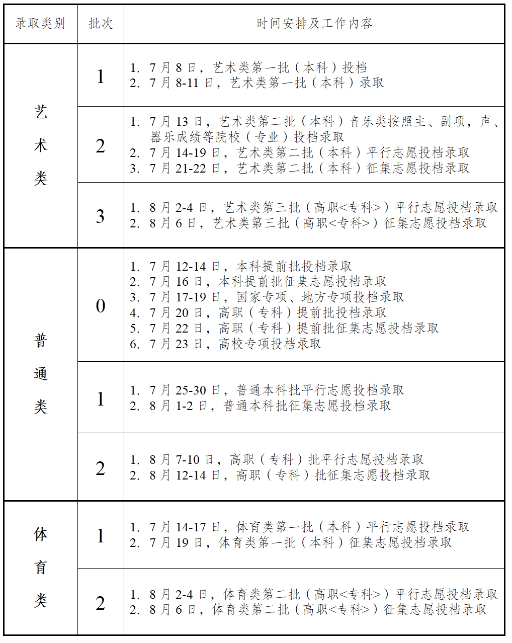2025年安徽省普通高校招生录取工作日程安排表