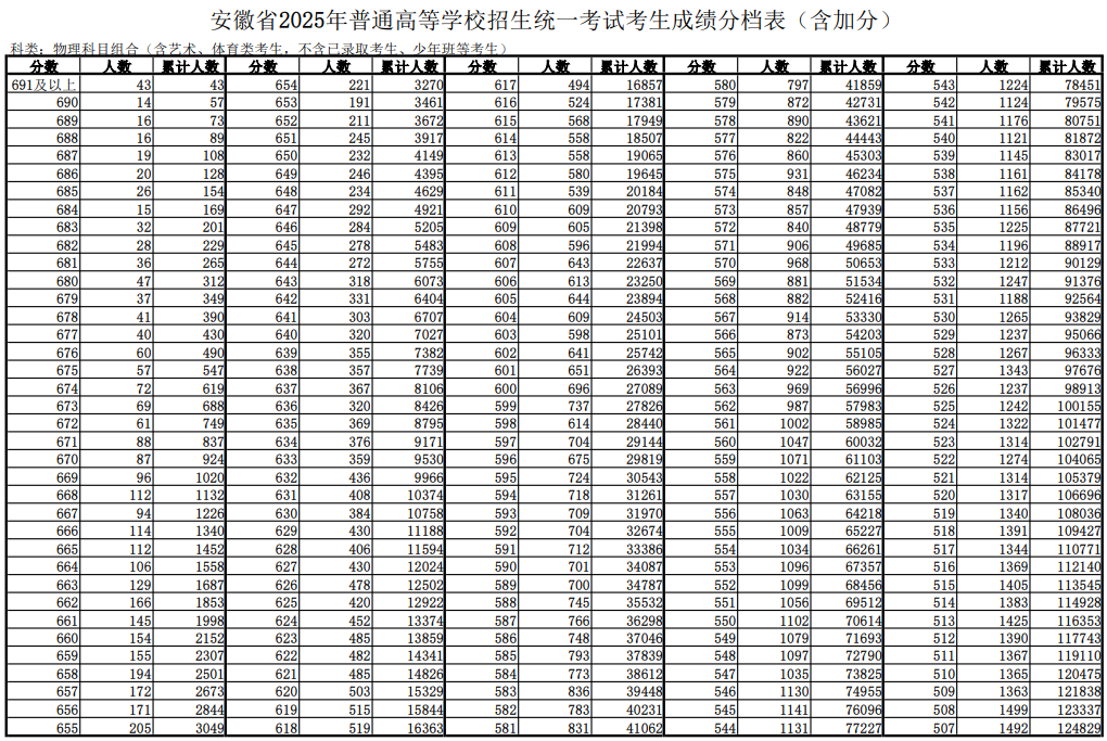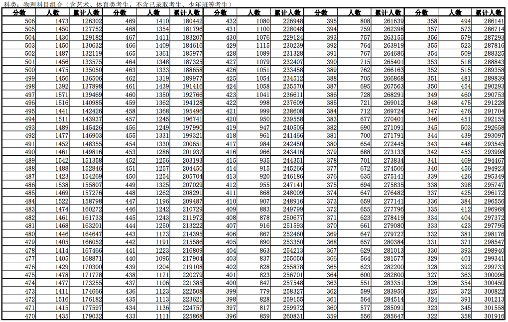 物理科目类分段表(含加分)(含艺术、体育类考生,不含已录取考生、少年班等考生)