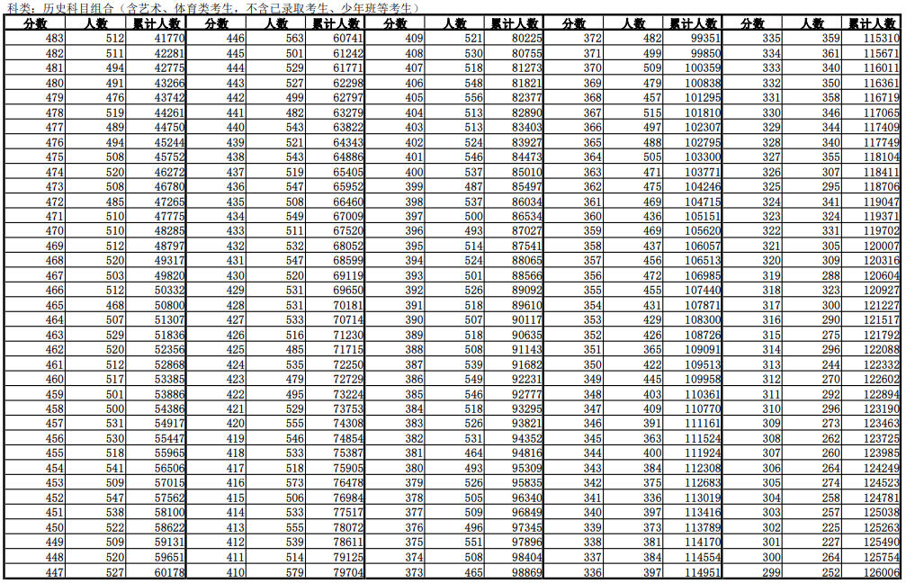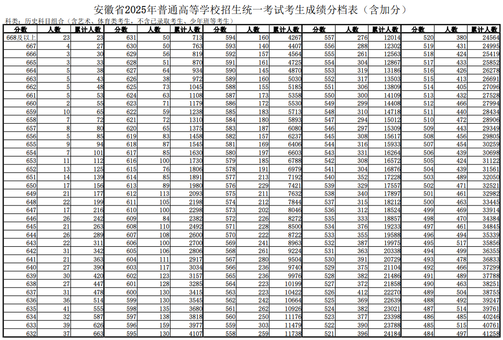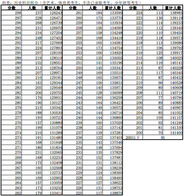 历史科目类分段表(含加分)(含艺术、体育类考生,不含已录取考生、少年班等考生)
