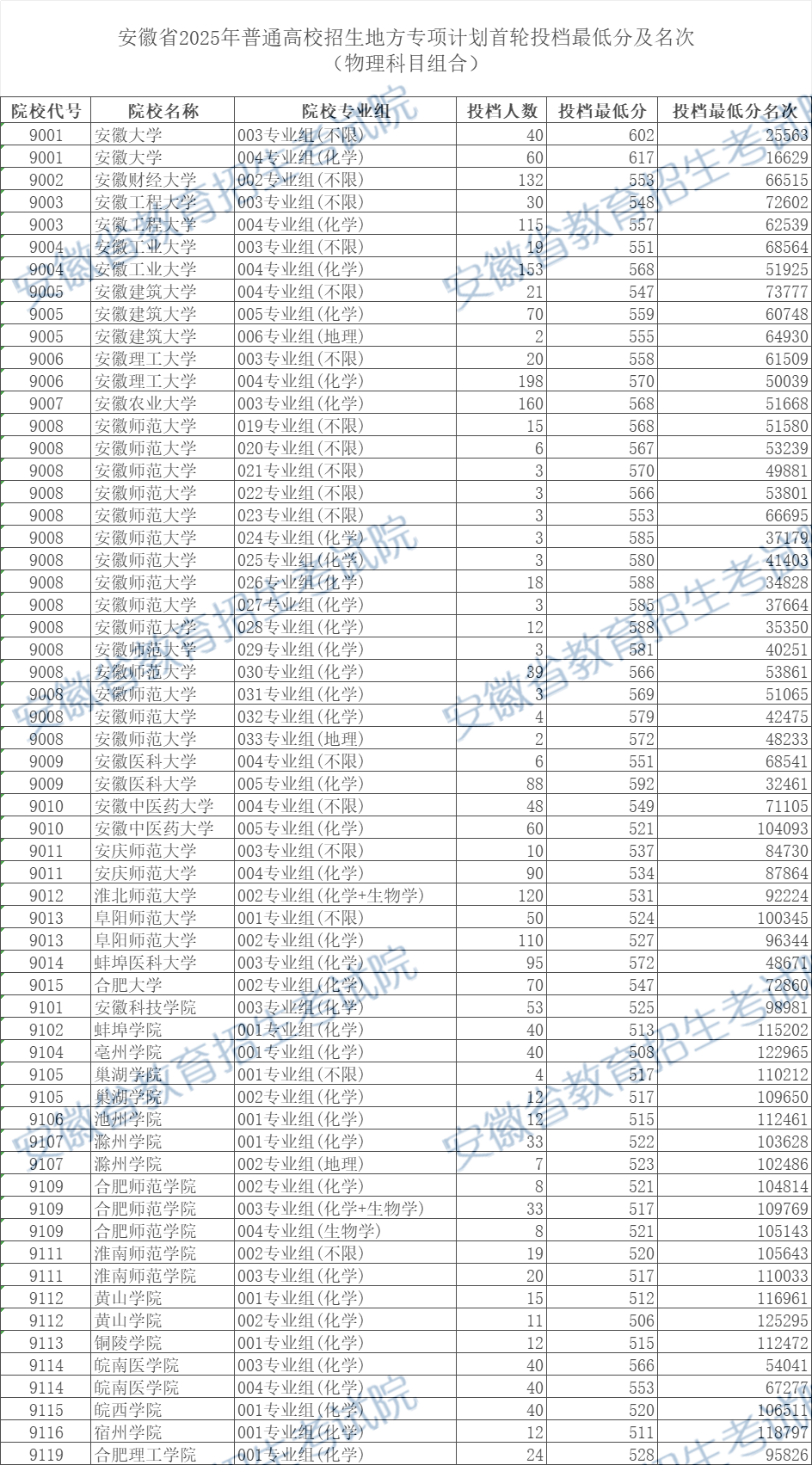 安徽省2025年普通高校招生地方专项计划首轮投档最低分及名次(物理科目组合)
