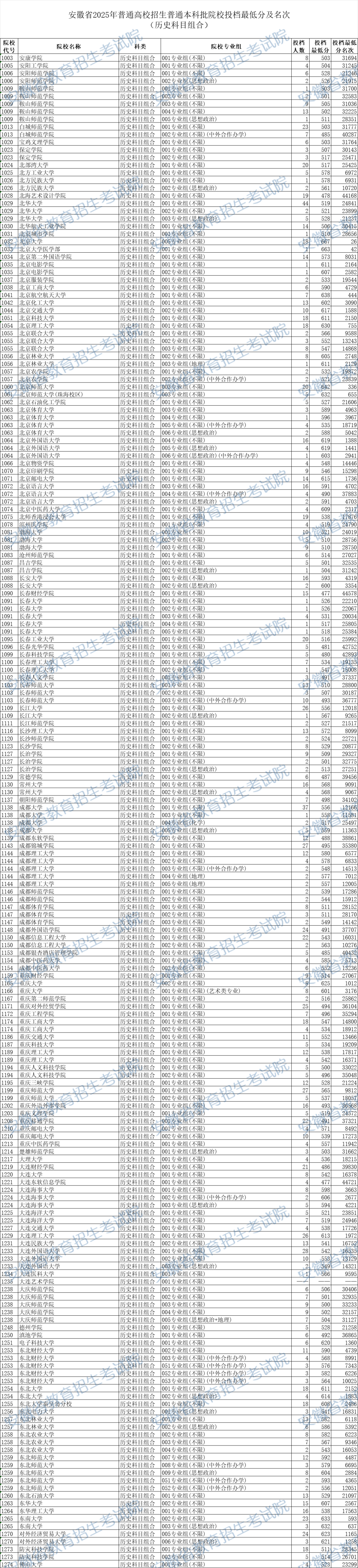 安徽省2025年普通高校招生普通本科批院校投档最低分及名次(历史科目组合)