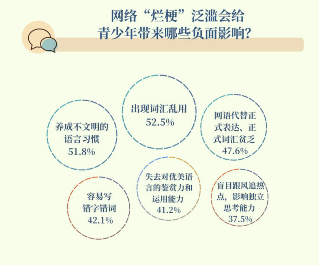这并非网络“烂梗”第一次引发担忧。此前,中国青年报的一项调查显示,69.0%的受访者担心网络“烂梗”泛滥影响青少年“好好说话”,受访家长对此有担心的比例更高,为74.4%。超半数受访者认为网络“烂梗”会导致青少年乱用词汇和养成不文明的语言习惯。