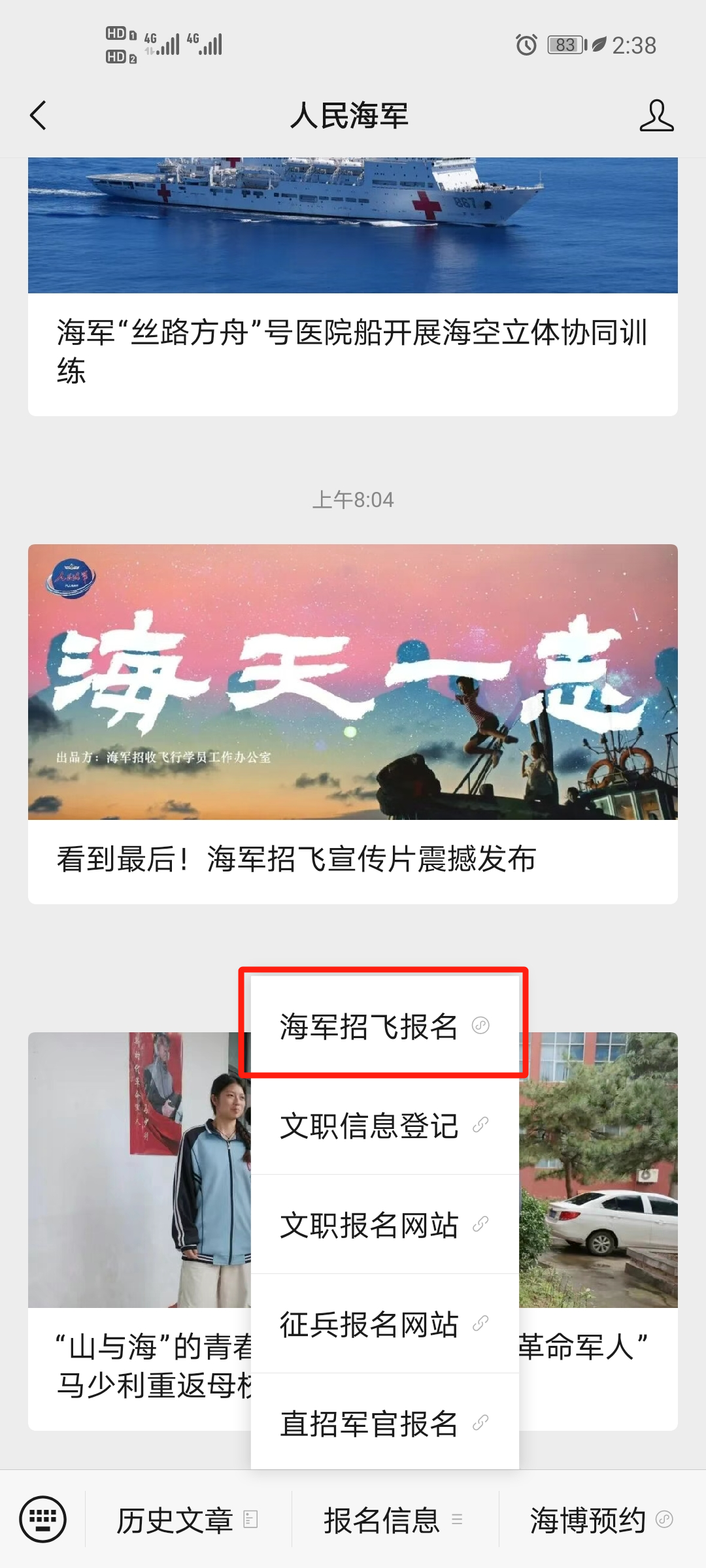 关注“人民海军”微信公众号,点击首页菜单“报名信息”→“海军招飞报名”进入“海军招飞”小程序。