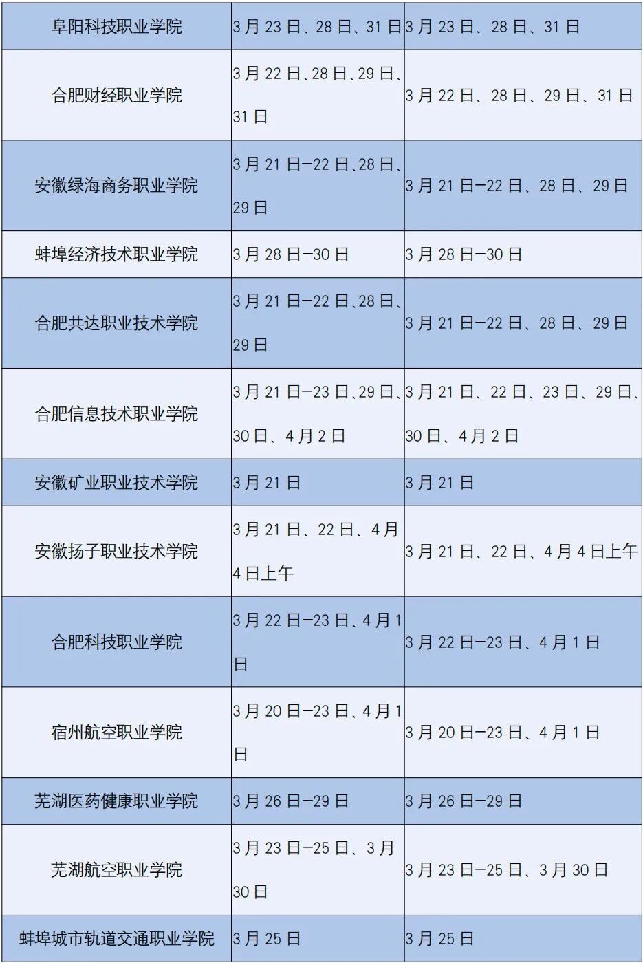 安徽省2026年分类考试院校测试(考试)时间一览表