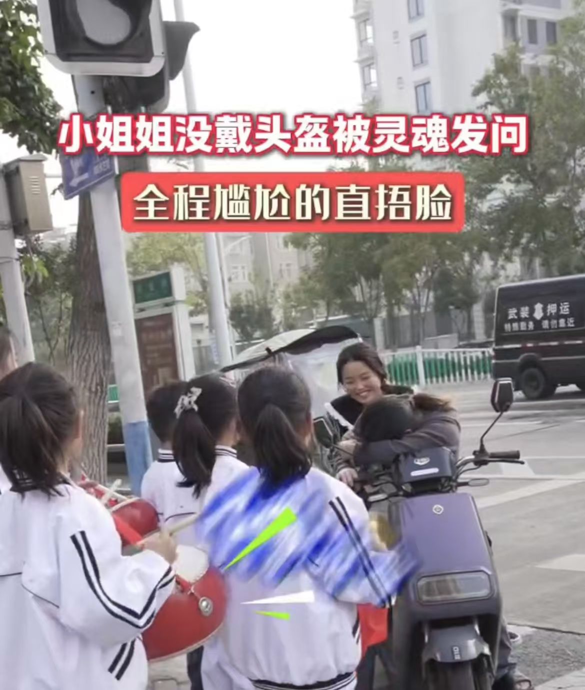 小姐姐没戴头盔被灵魂发问 全程尴尬的直捂脸