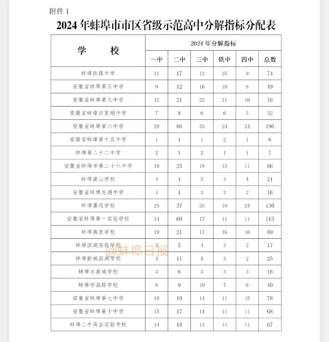 蚌埠市市区省级示范高中分解指标分配表出炉!