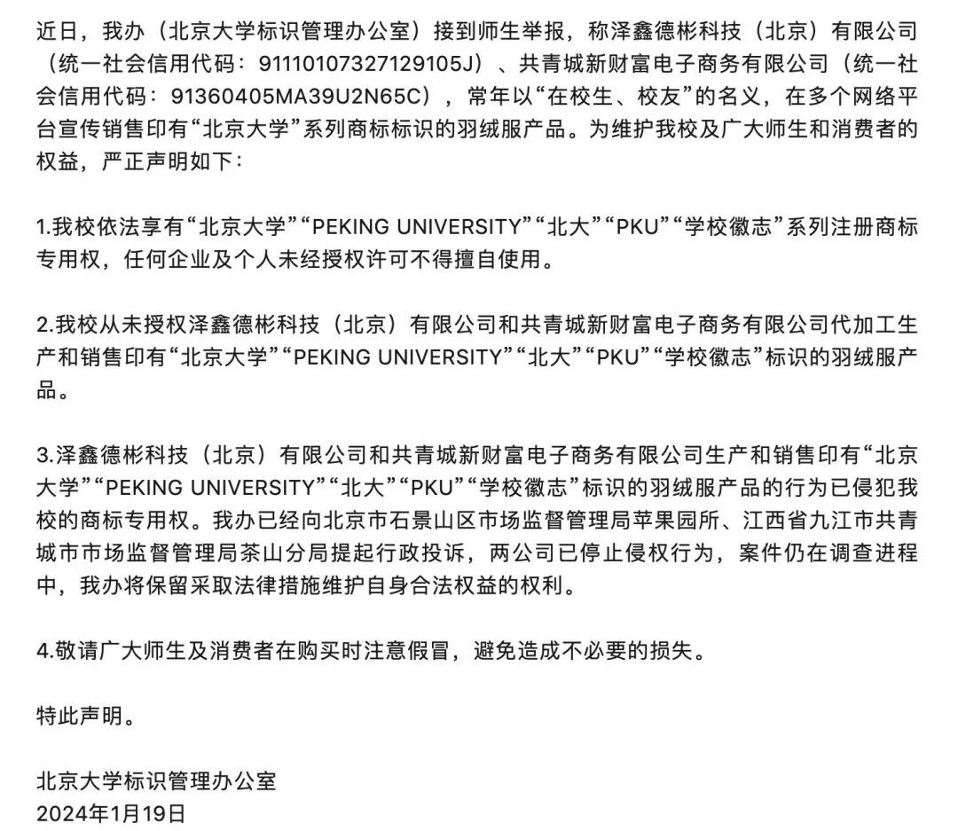商标标识被冒用于羽绒服?北京大学严正声明!