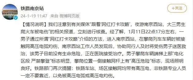 夜游“网红打卡地”,大学生爬火车被电伤!官方提醒→