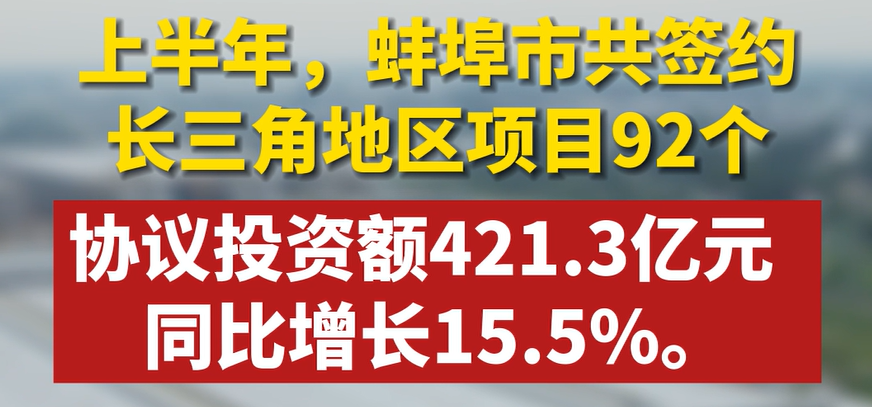 上半年,蚌埠市共签约长三角地区项目92个,协议投资额421.3亿元 ,同比增长15.5%