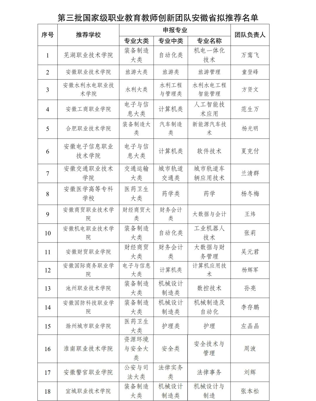 根据教育部教师工作司《关于开展第三批国家级职业教育教师创新团队建设工作的通知》,经学校申报、省级遴选等程序,拟推荐芜湖职业技术学院机电一体化技术创新团队等18个团队申报第三批国家级职业教育教师创新团队,现予以公示,公示时间为2023年10月30日至...