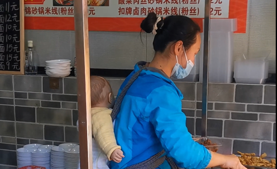 女子本弱,为母则刚,蚌埠年轻妈妈背着孩子卖快餐