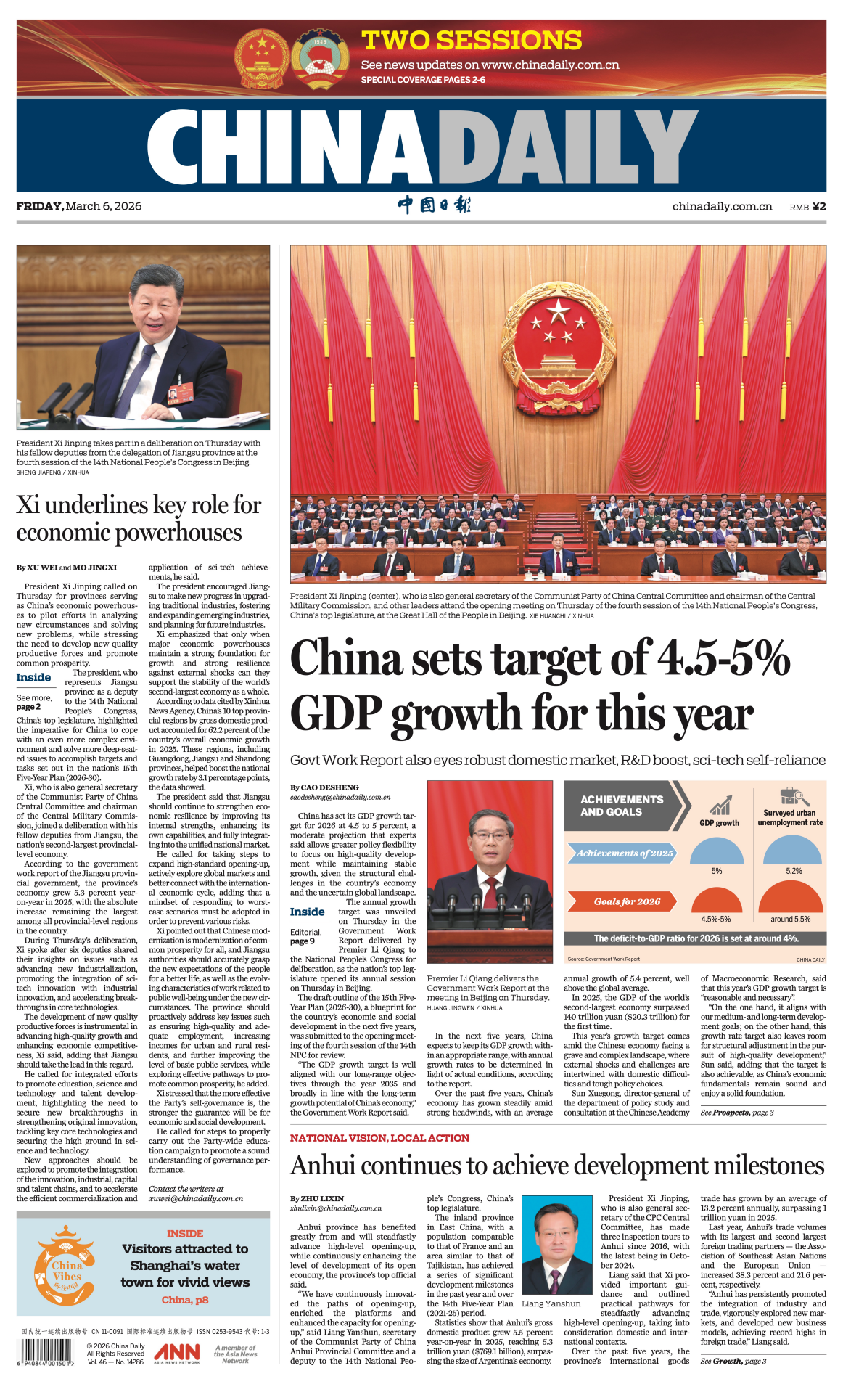 中国日报3月6日电(记者朱立新)今天,《中国日报》头版推出“中国式现代化的地方实践”高端访谈栏目——全国人大代表、安徽省委书记梁言顺专访报道Anhuicontinuestoachievedevelopmentmilestones(《安徽发展继续取得新的更大进展》)。
