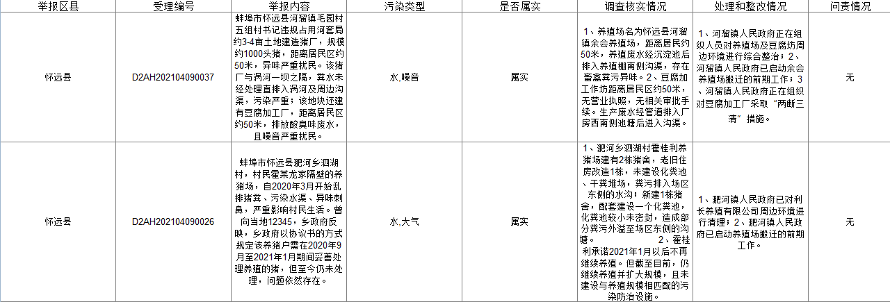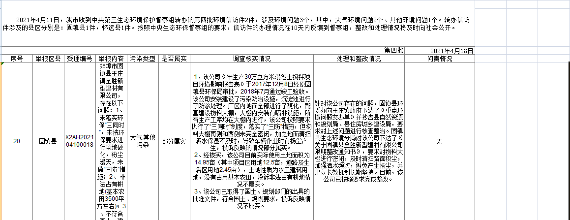 蚌埠市落实中央生态环保督察信访举报边督边改公开情况一览表(第四批)