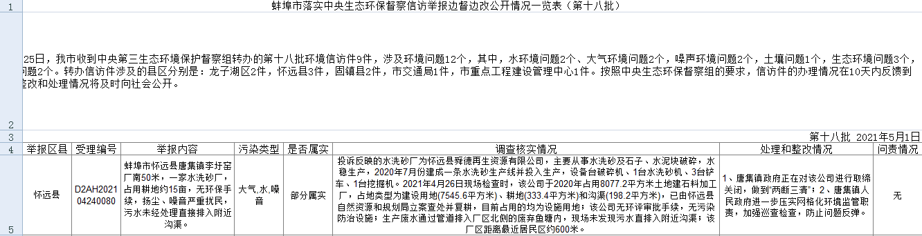 蚌埠市落实中央生态环保督察信访举报边督边改公开情况一览表(第十八批)