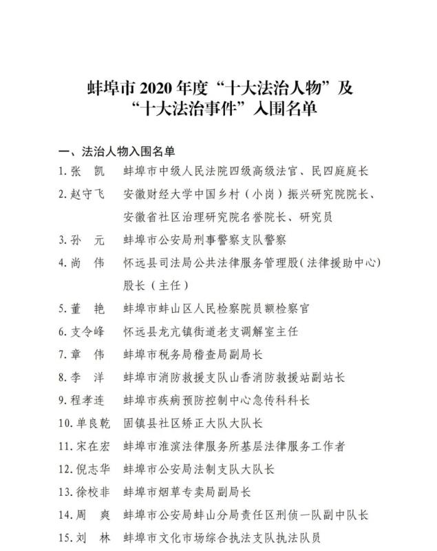 蚌埠市2020年度“十大法治人物”“十大法治事件”推荐候选入围名单公示