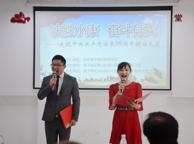 5月15日上午,由龙子湖区委宣传部主办、龙子湖区曹山街道幸福村社区承办、龙子湖区文化馆协办的“决胜小康 奋斗有我”——庆祝中国共产党诞辰99周年朗颂大赛在曹山街道举行。