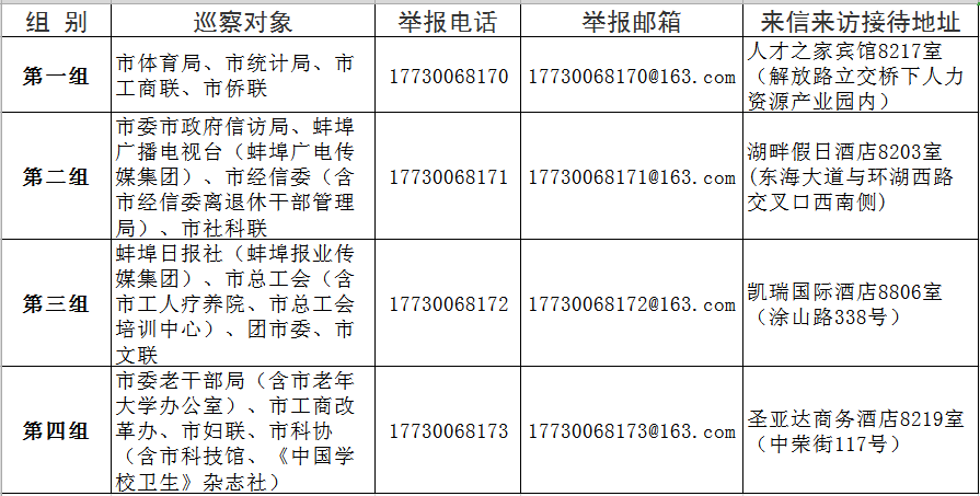 根据市委部署和市委巡察工作领导小组安排,3月20日至5月10日,市委组建4个巡察组,对市委老干部局(含市老年大学办公室)、市委市政府信访局、蚌埠日报社(蚌埠报业传媒集团)、蚌埠广播电视台(蚌埠广电传媒集团)、市经信委(含市经信委离退休干部管理局)、...