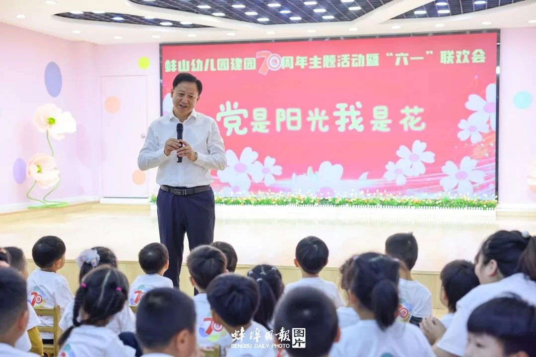 他指出,少年儿童是早晨八九点钟的太阳,充满朝气,是中华民族伟大复兴的未来,希望你们在老师的教导下从小听党话跟党走,树立远大理想,培养优良品德,勤奋学习知识,锻炼强健体魄,努力成长为德智体美劳全面发展的,能担当蚌埠振兴重任、民族复兴大任的栋梁之才。