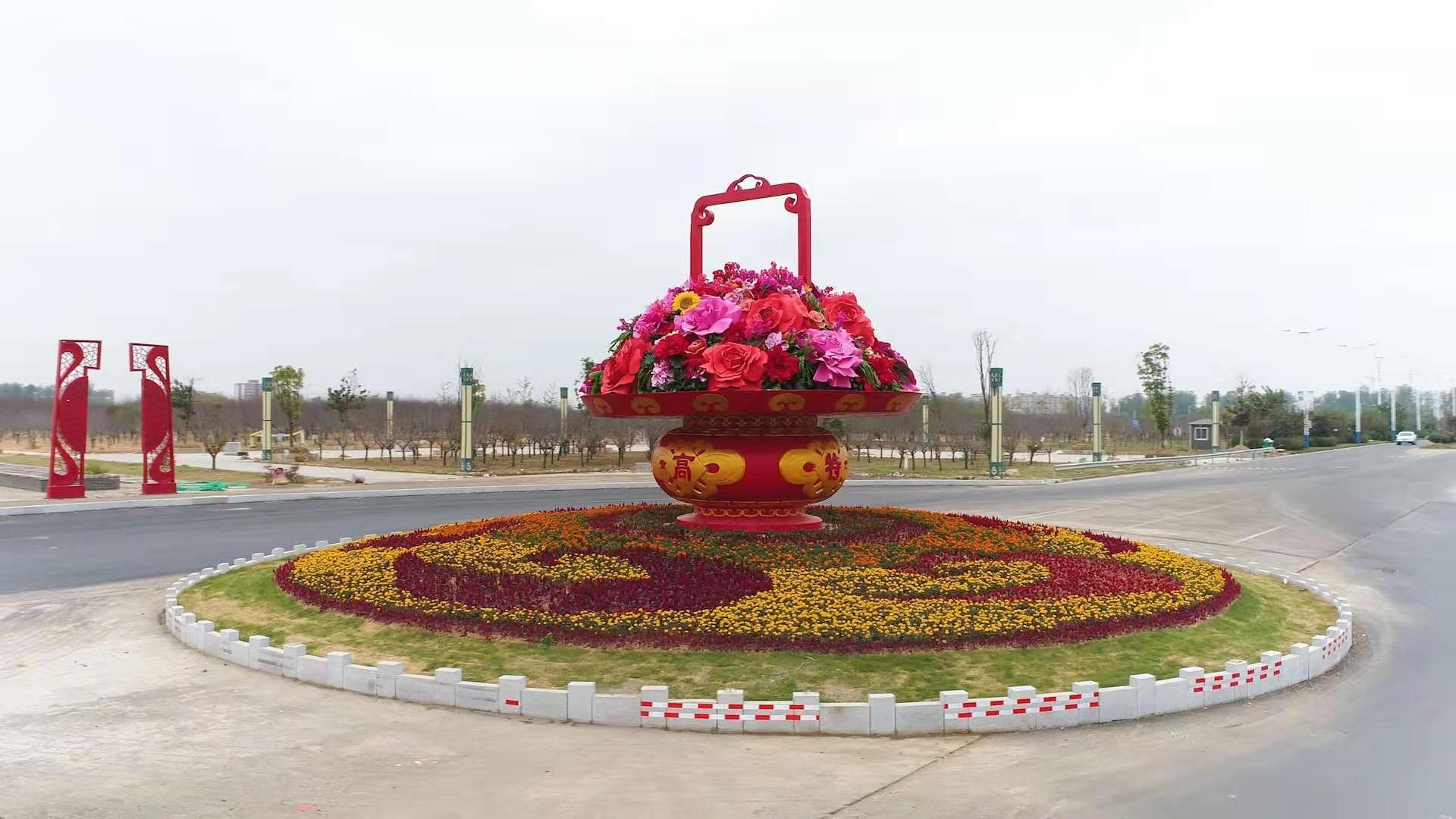 谷阳城遗址公园入口,硕大的花篮寓意“高特美强”新固镇欢迎八方宾朋。