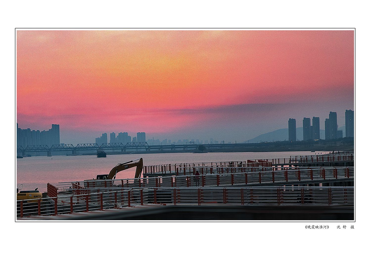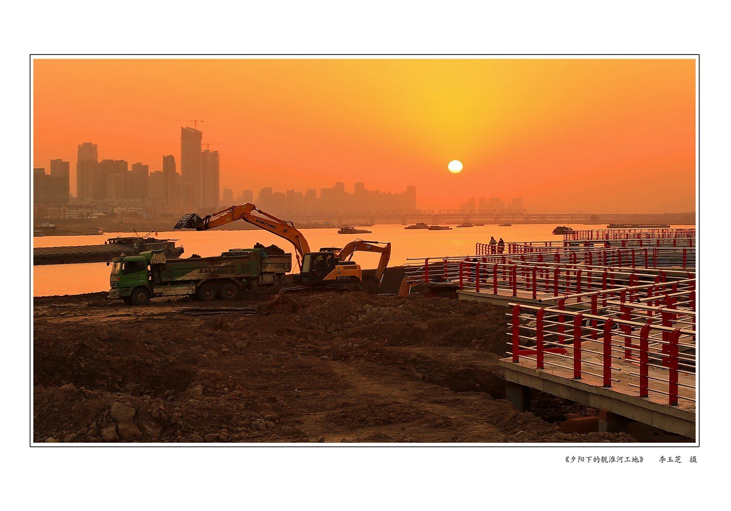 (淮河北岸)《夕阳下的靓淮河工地》李玉芝 摄