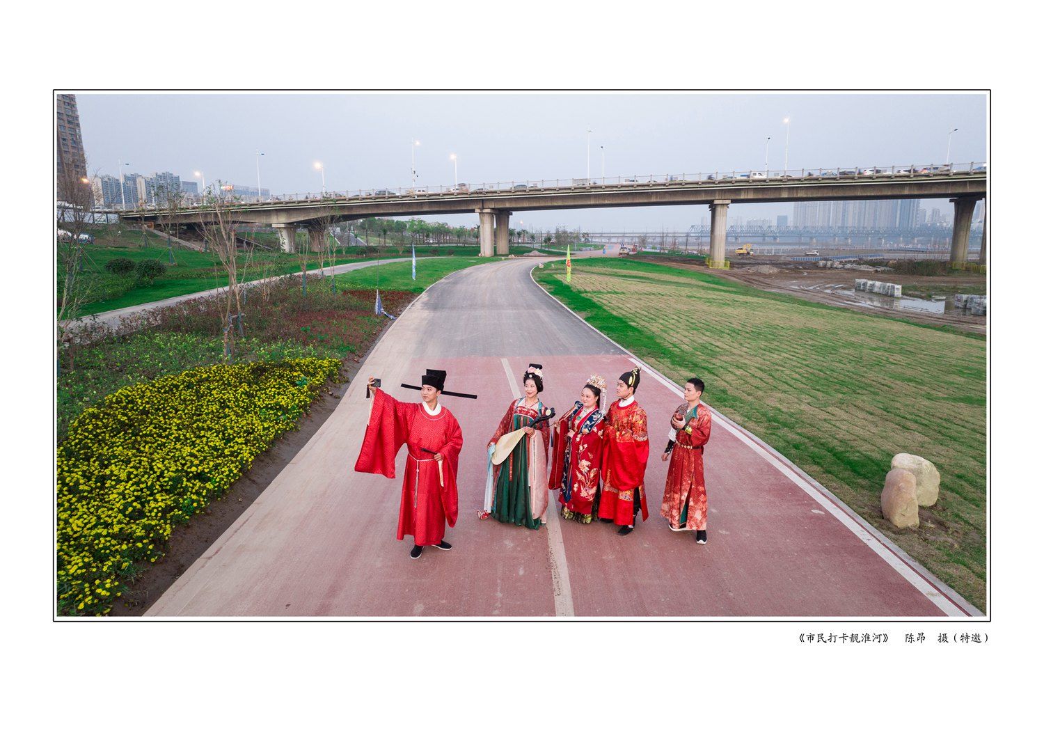 《市民打卡靓淮河》11月25日下午,身穿汉服的市民在靓淮河北岸公园打卡留念。 陈昂 摄