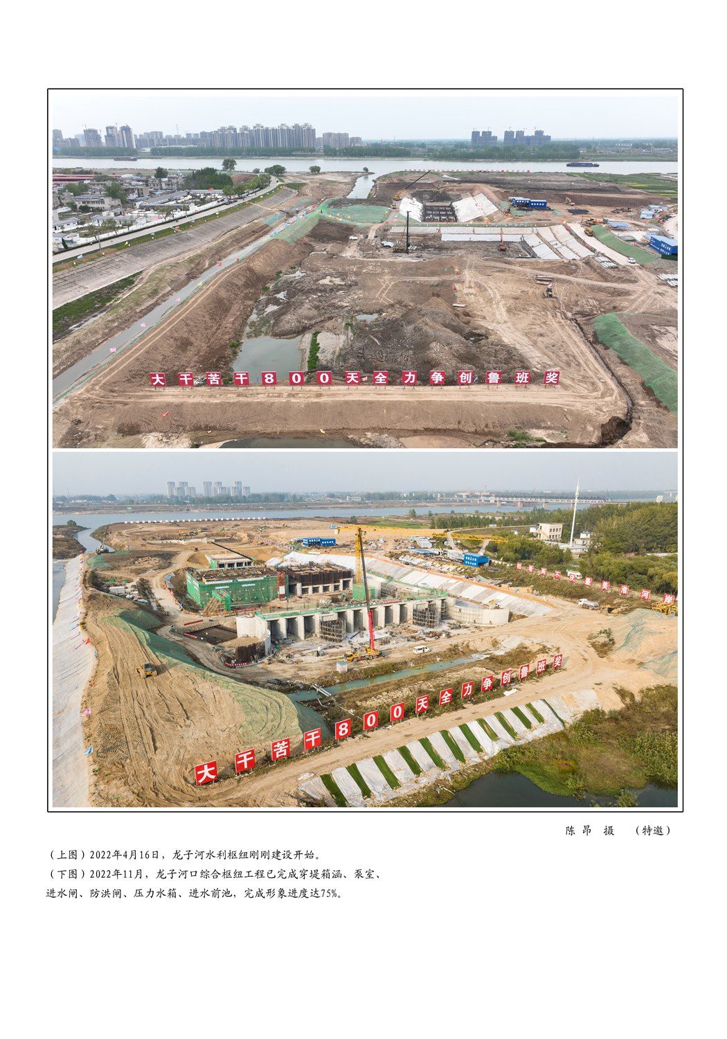 (上图)2022年4月16日,龙子河水利枢纽刚刚建设开始。(下图)2022年11月,龙子河口综合枢纽工程已完成穿堤箱涵、泵室、进水闸、防洪闸、压力水箱、进水前池,完成形象进度达75%。融媒体记者 陈昂 摄