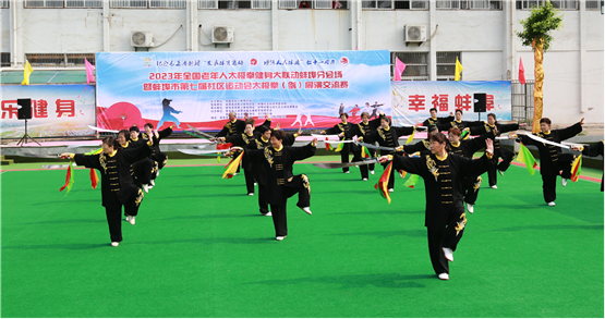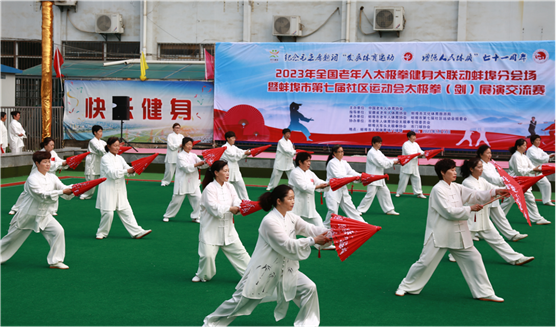 5月18日上午,2023年全国老年人太极拳健身大联动蚌埠分会场暨蚌埠市第七届社区运动会太极拳(剑)展示交流比赛活动在蚌埠市人民体育场举行。