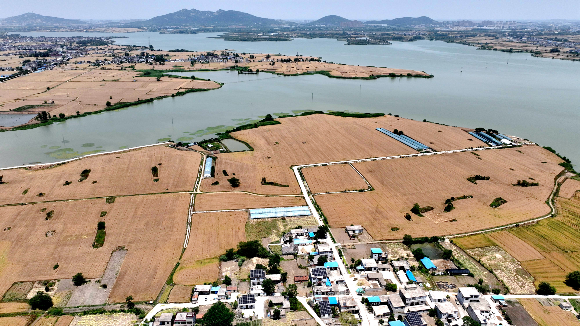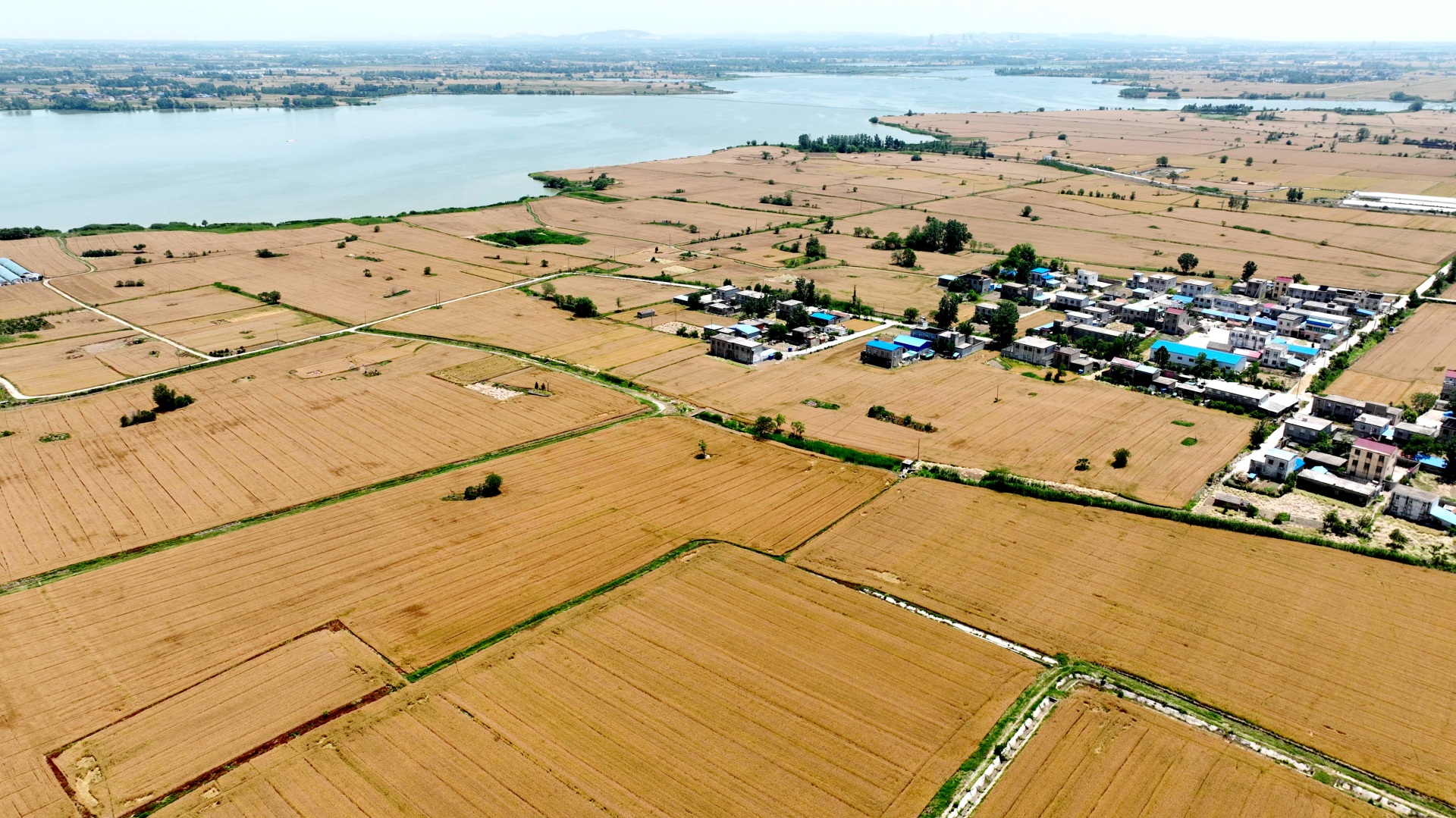 5月23日中午,航拍禹会区马城镇天河岸边的麦田,金黄麦穗给大地披上了金装,呈现出一派丰收景象。